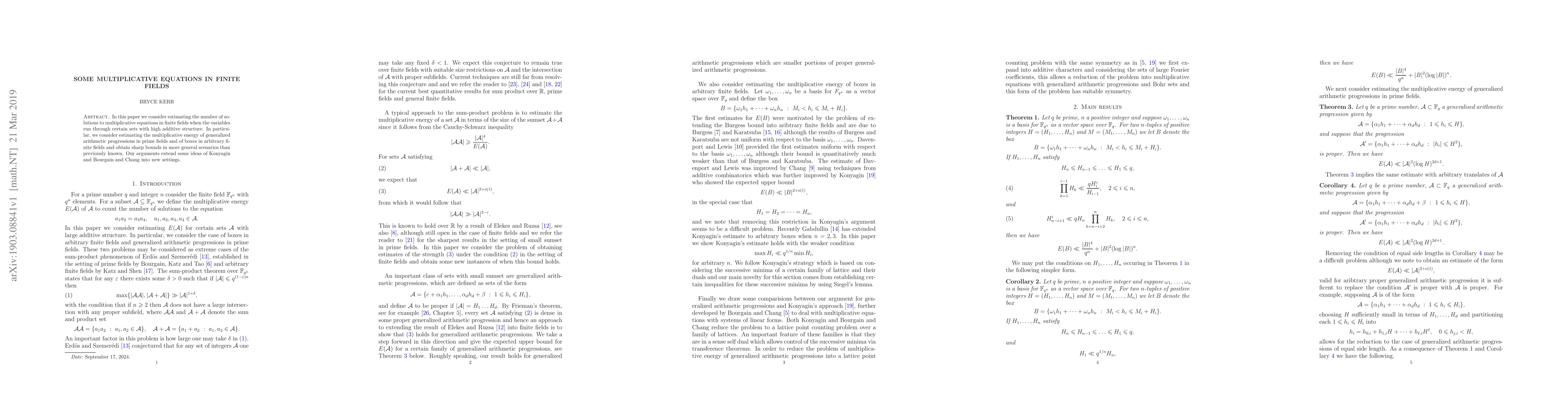 In this paper we consider estimating the number of solutions to multiplicative equations in finite fields when the variables run through certain sets with high additive structure. In particular, we consider estimating the multiplicative energy of generalized arithmetic progressions in prime fields and of boxes in arbitrary finite fields and obtain sharp bounds in more general scenarios than previously known. Our arguments extend some ideas of Konyagin and Bourgain and Chang into new settings.