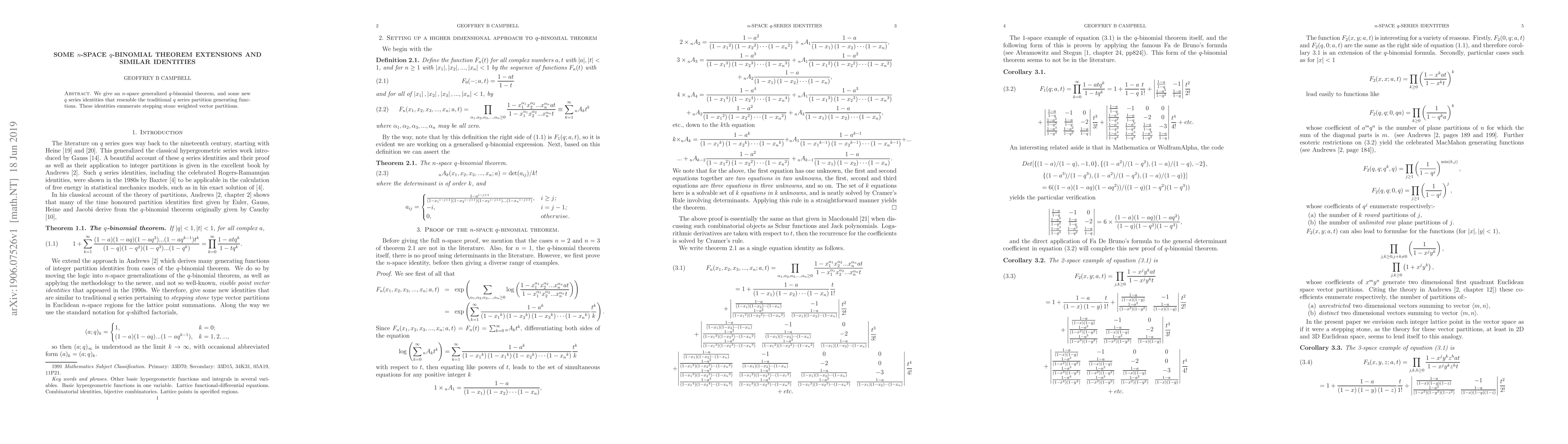 We give an $n$-space generalized $q$-binomial theorem, and some new $q$ series identities that resemble the traditional $q$ series partition generating functions. These identities enumerate stepping stone weighted vector partitions.