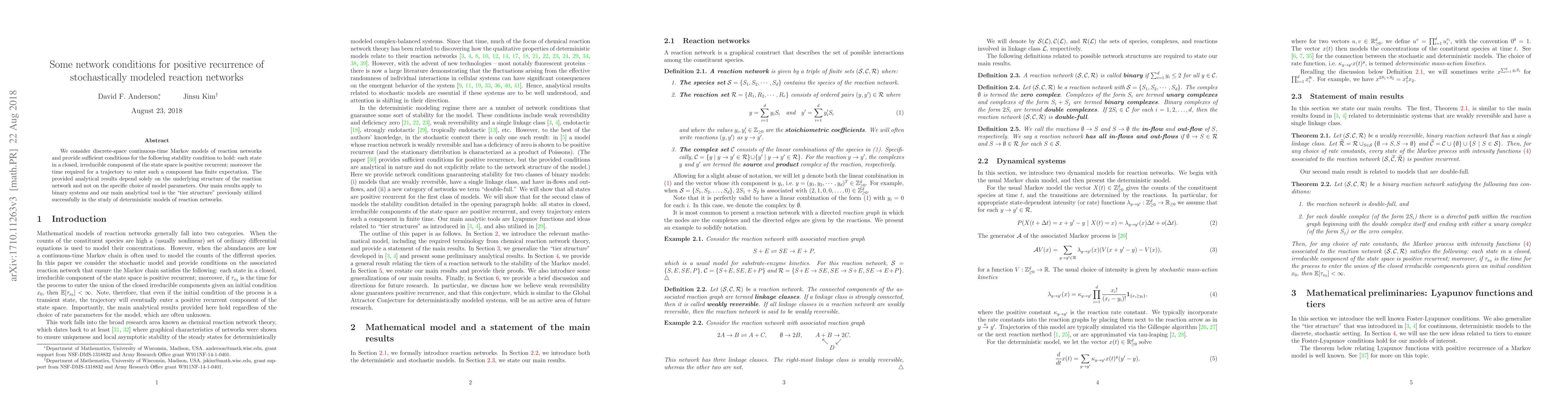 This paper establishes conditions for the positive recurrence of states in stochastic reaction networks modeled by discrete-space continuous-time Markov processes. It leverages the "tier structure" to derive analytical results that depend only on the network's structure, not on specific parameters, applicable to binary systems.