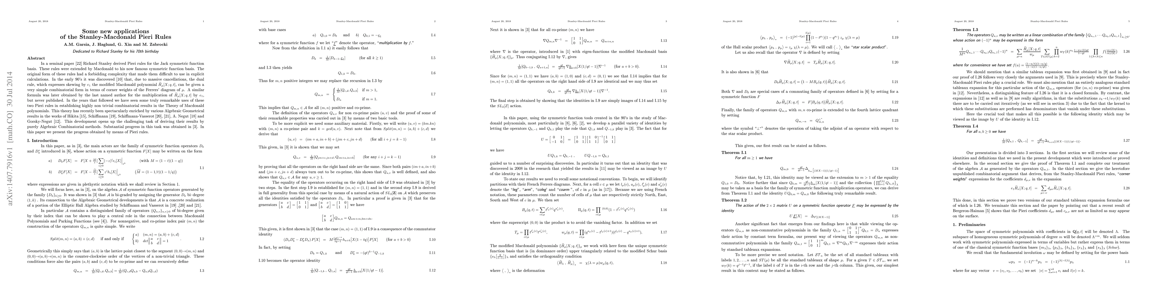This paper explores new applications of the Stanley-Macdonald Pieri rules, which simplify the multiplication and skewing of Macdonald polynomials, to derive significant results in the Theory of Macdonald polynomials and to connect these results with recent Algebraic Geometrical advancements.