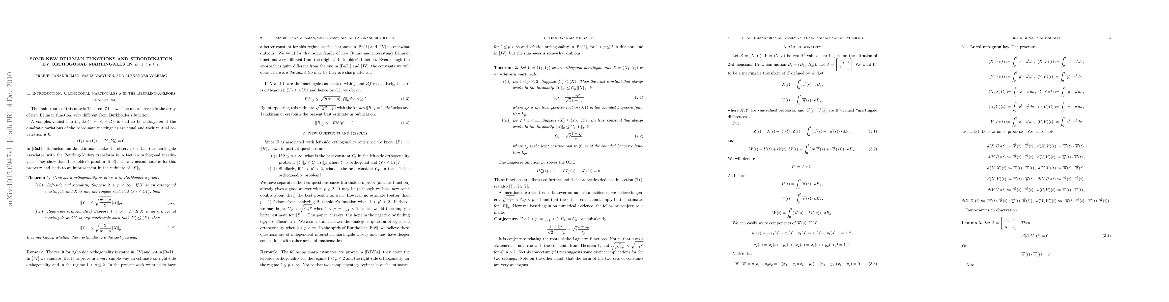This paper constructs novel Bellman functions distinct from Burkholder's to estimate the $L^p$ norm of a subordinated martingale under orthogonality conditions, utilizing the Monge-Ampere equation, and applies these to martingales in $1<p\le 2$. The study leverages orthogonality properties between two-dimensional Brownian motion martingales.