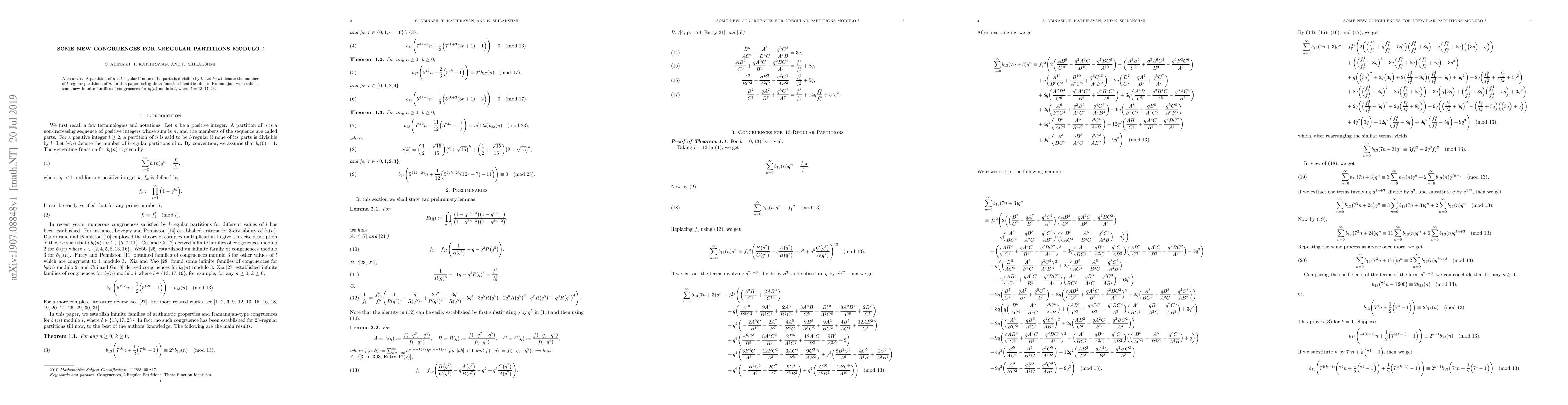 This paper establishes new infinite families of congruences for $l$-regular partitions, where $l=13,17,23$, using theta function identities from Ramanujan. The number $b_l(n)$ represents the count of $l$-regular partitions of $n$, with none of its parts divisible by $l$.