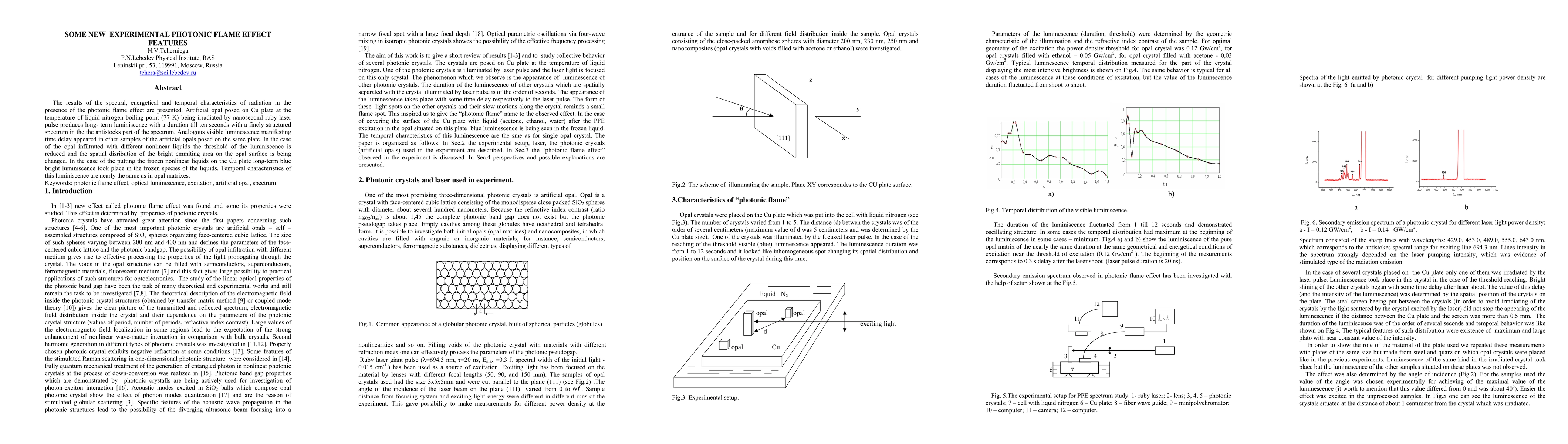 The results of the spectral, energetical and temporal characteristics of radiation in the presence of the photonic flame effect are presented. Artificial opal posed on Cu plate at the temperature of liquid nitrogen boiling point (77 K) being irradiated by nanosecond ruby laser pulse produces long- term luminiscence with a duration till ten seconds with a finely structured spectrum in the the antistocks part of the spectrum. Analogous visible luminescence manifesting time delay appeared in other samples of the artificial opals posed on the same plate. In the case of the opal infiltrated with different nonlinear liquids the threshold of the luminiscence is reduced and the spatial disribution of the bright emmiting area on the opal surface is being changed. In the case of the putting the frozen nonlinear liquids on the Cu plate long-term blue bright luminiscence took place in the frozen species of the liquids. Temporal characteristics of this luminiscence are nearly the same as in opal matrixes.