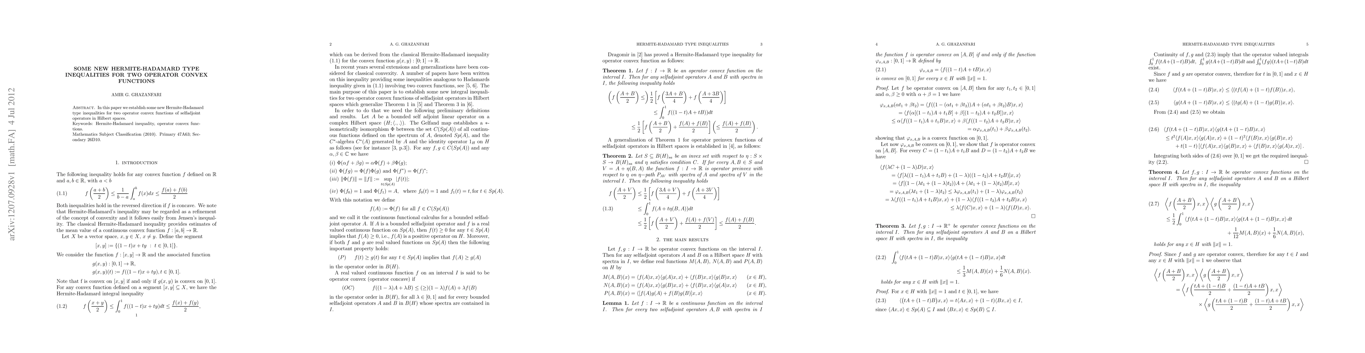 Summary: This paper introduces novel Hermite-Hadamard type inequalities for two operator convex functions defined on selfadjoint operators within Hilbert spaces. The inequalities extend classical results to the operator convex setting.