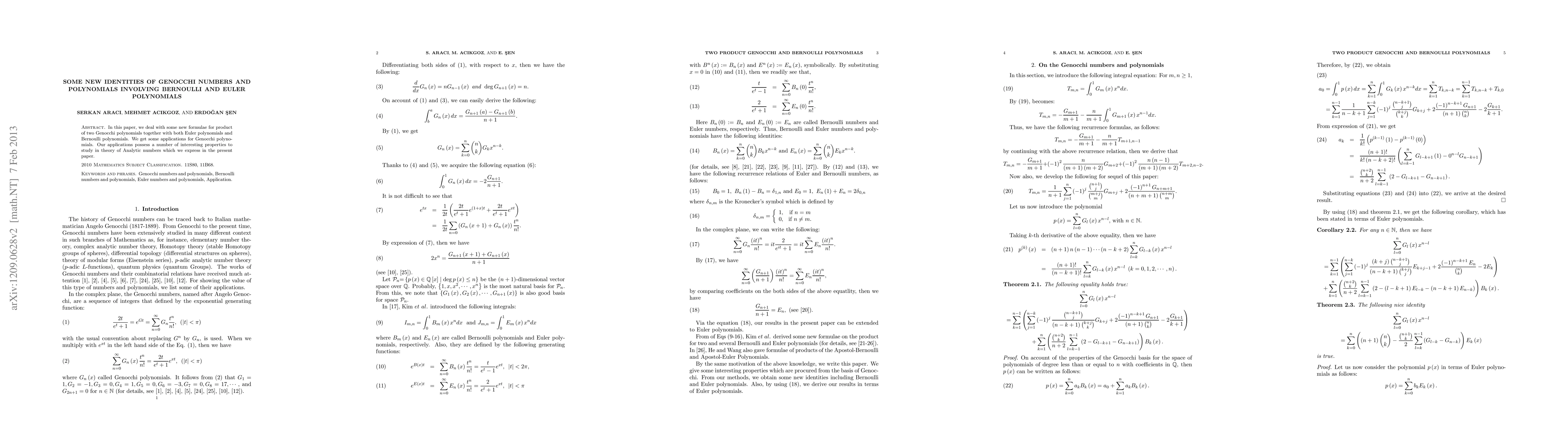 This paper introduces new identities for two product Genocchi polynomials combined with Euler and Bernoulli polynomials, and explores their applications and properties in the Theory of Analytic numbers. The findings reveal interesting characteristics worthy of further study.