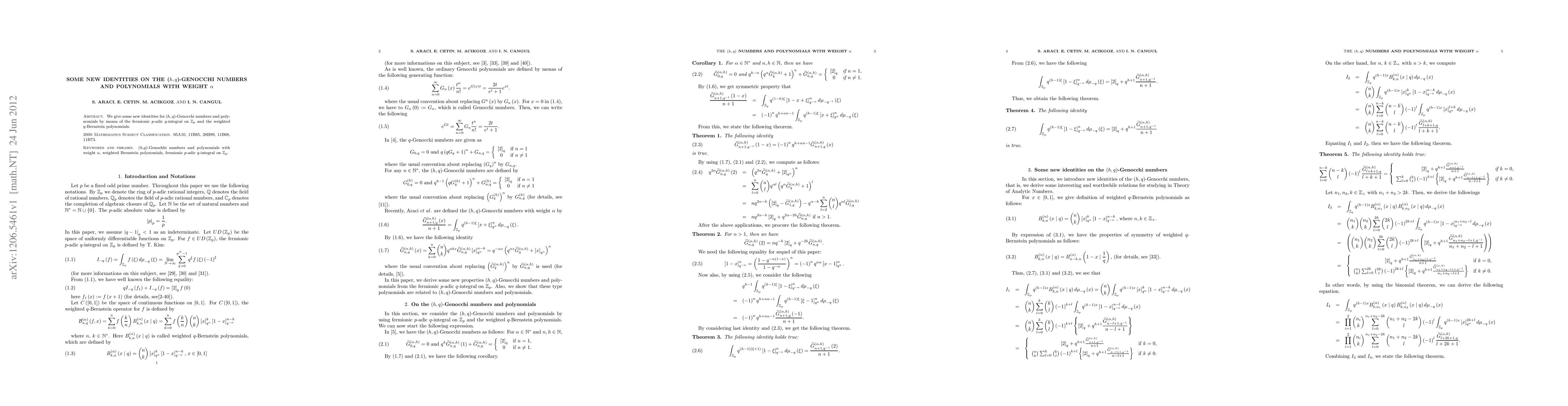 Summary: This paper introduces new identities for (h,q)-Genocchi numbers and polynomials using the fermionic p-adic q-integral on Zp and weighted q-Bernstein polynomials. The results provide novel insights into the structure of these mathematical constructs.