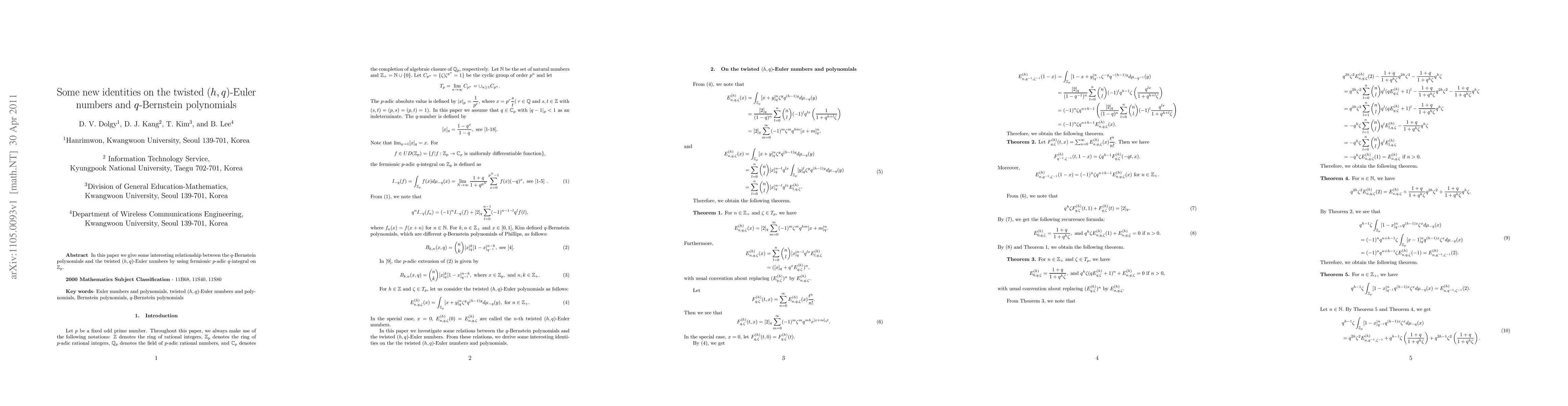 In this paper we give some interesting relationships between twisted (h,q)-Euler numbers and q-Berstein polynomnials by using fermionic p-adic q-integrals on Zp