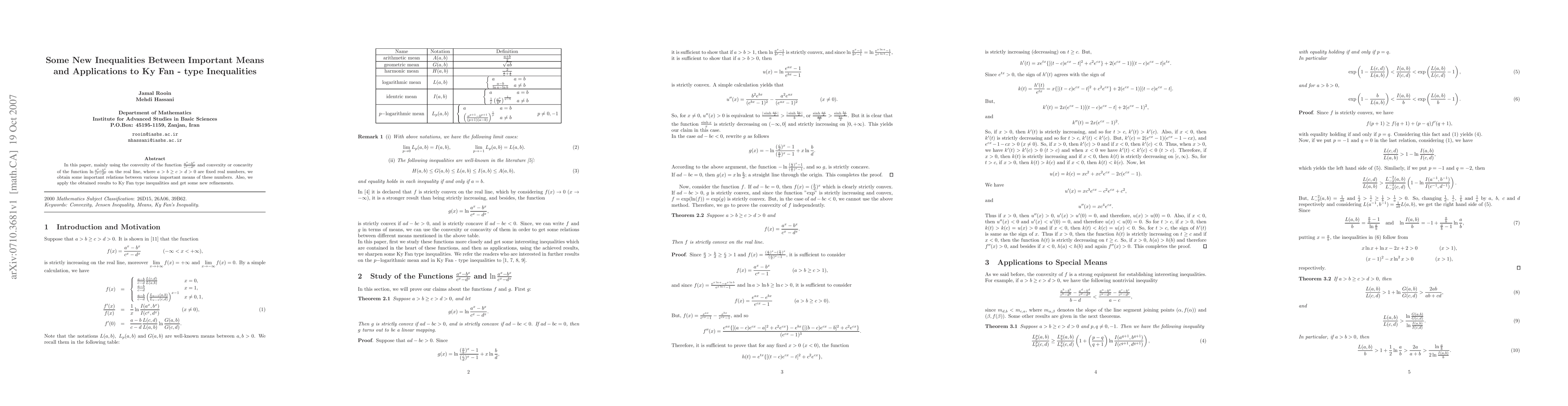 In this paper, mainly using the convexity of the function $\frac{a^x-b^x}{c^x-d^x}$ and convexity or concavity of the function $\ln\frac{a^x-b^x}{c^x-d^x}$ on the real line, where $a>b\geq c>d>0$ are fixed real numbers, we obtain some important relations between various important means of these numbers. Also, we apply the obtained results to Ky Fan type inequalities and get some new refinements.