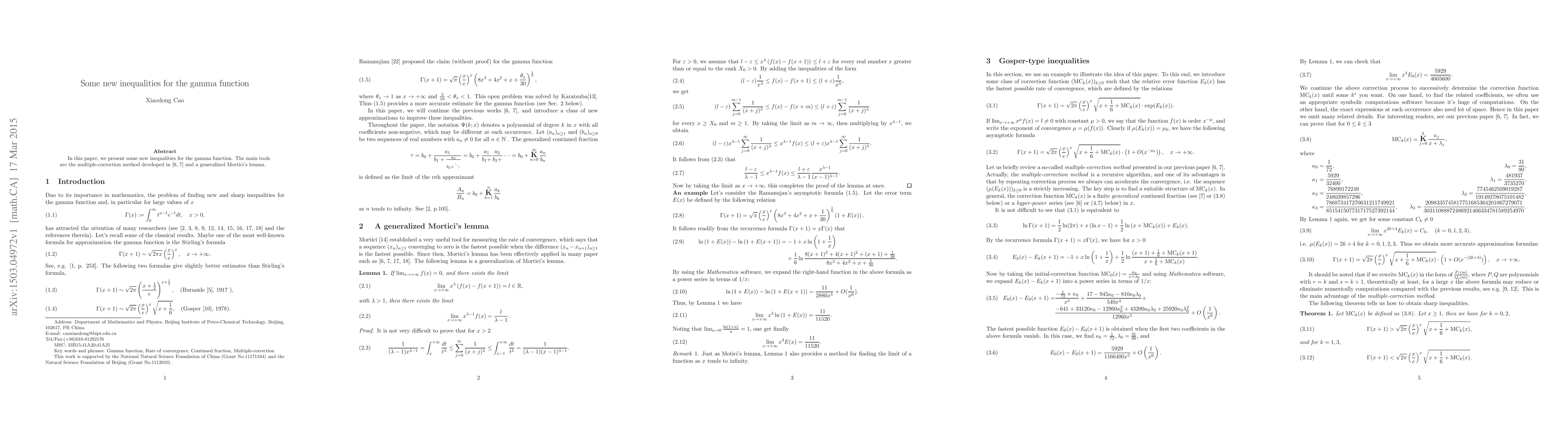Summary: This paper introduces novel inequalities for the gamma function using the multiple-correction method and a generalized Mortici's lemma, building on previous methodological developments.