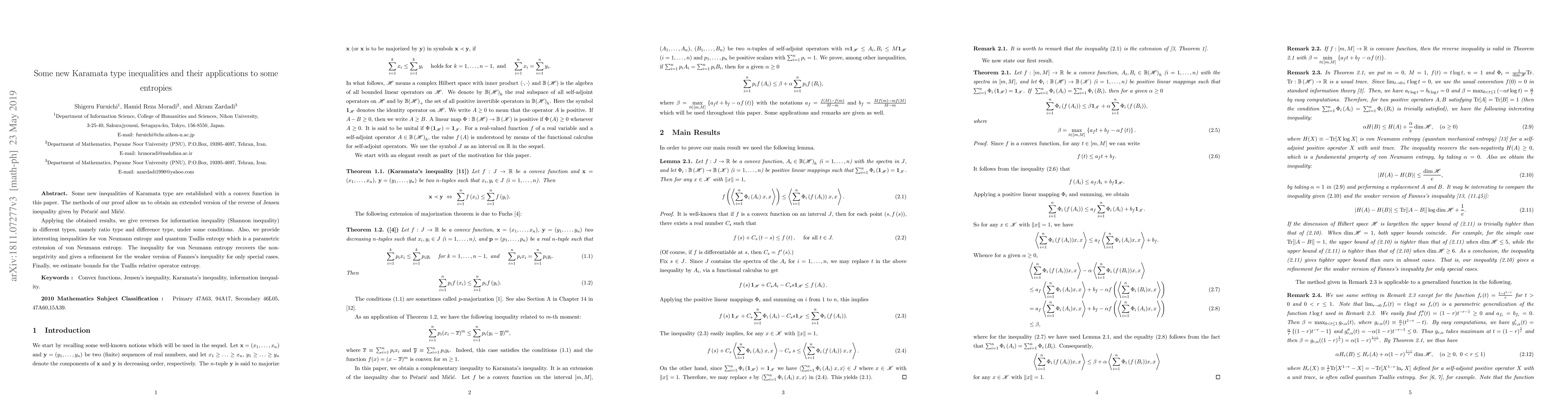 Some new inequalities of Karamata type are established with a convex function in this paper. The methods of our proof allow us to obtain an extended version of the reverse of Jensen inequality given by Pe{\v} cari\'c and Mi\'ci\'c. Applying the obtained results, we give reverses for information inequality (Shannon inequality) in different types, namely ratio type and difference type, under some conditions. Also, we provide interesting inequalities for von Neumann entropy and quantum Tsallis entropy which is a parametric extension of von Neumann entropy. The inequality for von Neumann entropy recovers the non-negativity and gives a refinement for the weaker version of Fannes's inequality for only special cases. Finally, we estimate bounds for the Tsallis relative operator entropy.