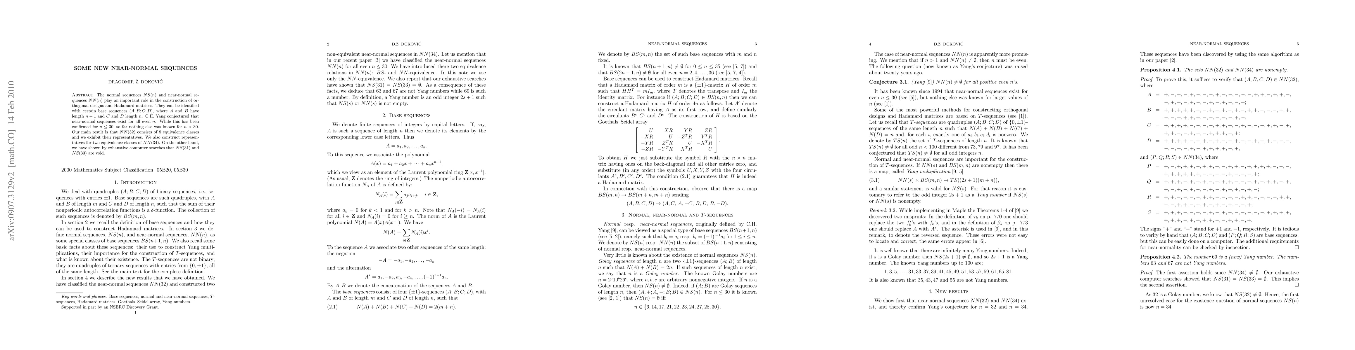 This paper demonstrates the existence of near-normal sequences for even values of n up to 34, specifically identifying 8 equivalence classes for NN(32) and 2 for NN(34). It also reveals that no normal sequences exist for n=31 and 33.