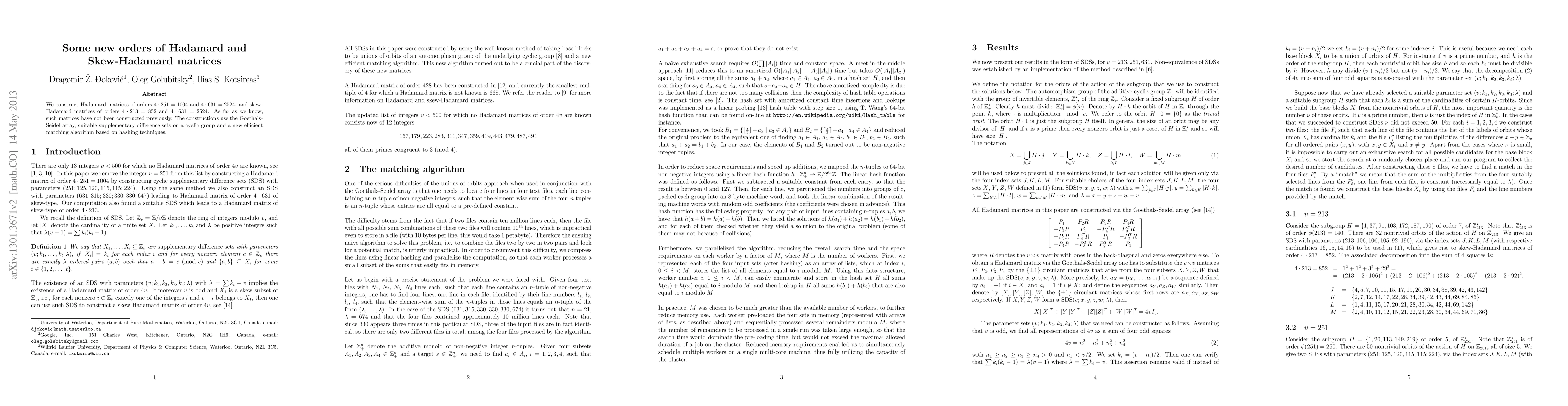 We construct Hadamard matrices of orders 4x251 = 1004 and 4x631 = 2524, and skew-Hadamard matrices of orders 4x213 = 852 and 4x631 = 2524. As far as we know, such matrices have not been constructed previously. The constructions use the Goethals-Seidel array, suitable supplementary difference sets on a cyclic group and a new efficient matching algorithm based on hashing techniques.