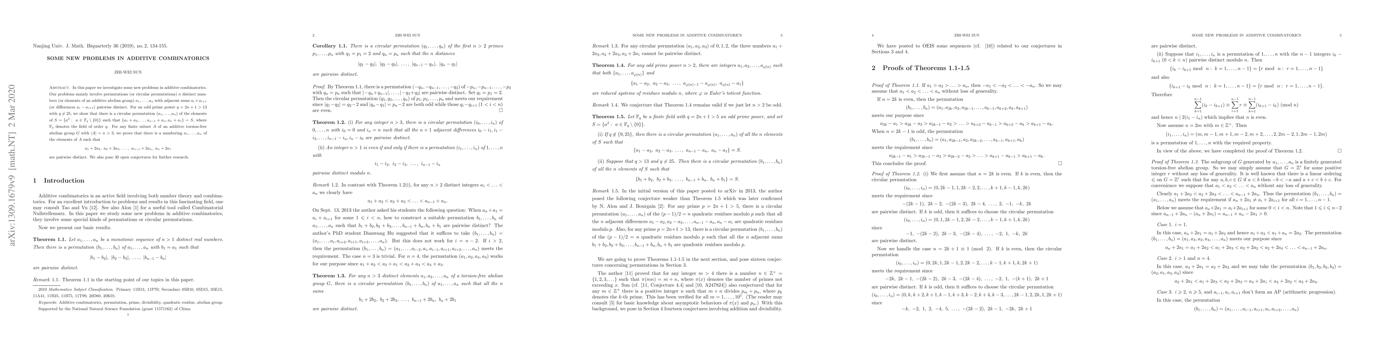 In this paper we investigate some new problems in additive combinatorics. Our problems mainly involve permutations (or circular permutations) $n$ distinct numbers (or elements of an additive abelian group) $a_1,\ldots,a_n$ with adjacent sums $a_i+a_{i+1}$ (or differences $a_i-a_{i+1}$) pairwise distinct. For an odd prime power $q=2n+1>13$ with $q\not=25$, we show that there is a circular permutation $(a_1,\ldots,a_n)$ of the elements of $S=\{a^2:\ a\in\mathbb F_q\setminus\{0\}\}$ such that $\{a_1+a_2,\ldots,a_{n-1}+a_n,a_n+a_1\}=S$, where $\mathbb F_q$ denotes the field of order $q$. For any finite subset $A$ of an additive torsion-free abelian group $G$ with $|A|=n>3$, we prove that there is a numbering $a_1,\ldots,a_n$ of the elements of $A$ such that $$a_1+2a_2,\ a_2+2a_3,\ \ldots,\ a_{n-1}+2a_n,\ a_n+2a_1$$ are pairwise distinct. We also pose 30 open conjectures for further research.