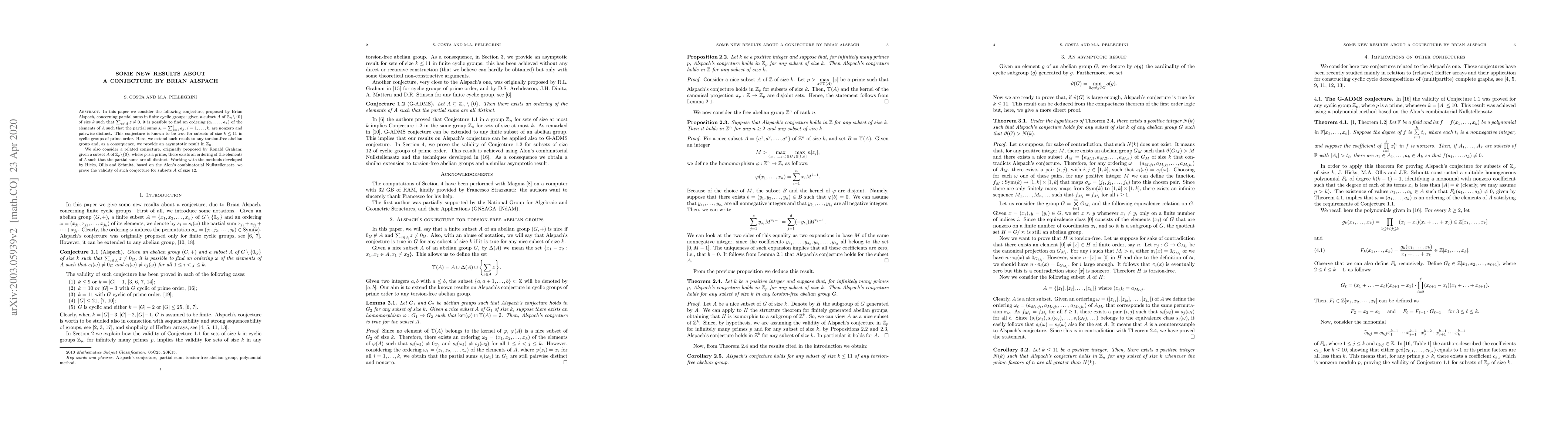 In this paper we consider the following conjecture, proposed by Brian Alspach, concerning partial sums in finite cyclic groups: given a subset $A$ of $\mathbb{Z}_n\setminus \{0\}$ of size $k$ such that $\sum_{z\in A} z\not= 0$, it is possible to find an ordering $(a_1,\ldots,a_k)$ of the elements of $A$ such that the partial sums $s_i=\sum_{j=1}^i a_j$, $i=1,\ldots,k$, are nonzero and pairwise distinct. This conjecture is known to be true for subsets of size $k\leq 11$ in cyclic groups of prime order. Here, we extend such result to any torsion-free abelian group and, as a consequence, we provide an asymptotic result in $\mathbb{Z}_n$. We also consider a related conjecture, originally proposed by Ronald Graham: given a subset $A$ of $\mathbb{Z}_p\setminus\{0\}$, where $p$ is a prime, there exists an ordering of the elements of $A$ such that the partial sums are all distinct. Working with the methods developed by Hicks, Ollis and Schmitt, based on the Alon's combinatorial Nullstellensatz, we prove the validity of such conjecture for subsets $A$ of size $12$.