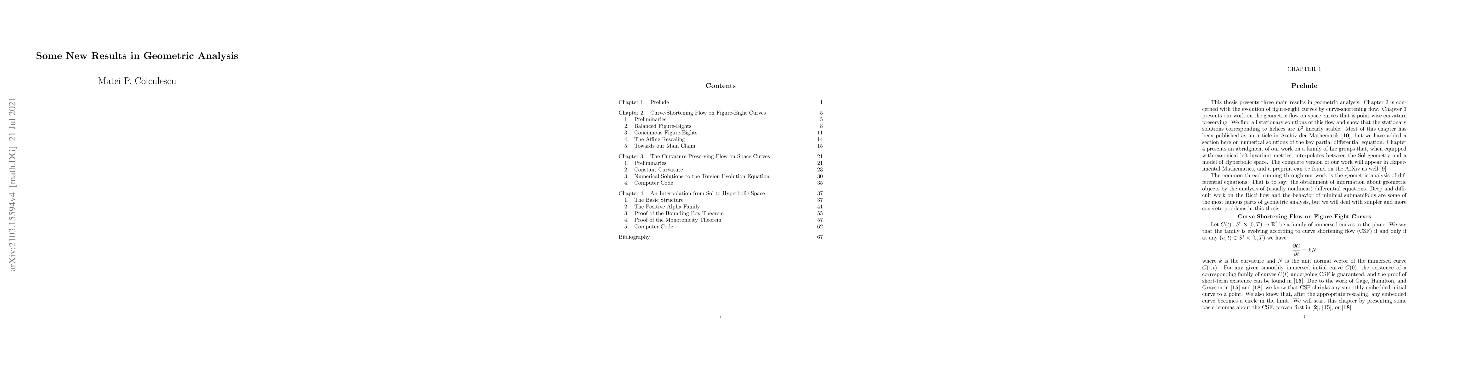 This thesis presents three results in geometric analysis. We first analyze the curve-shortening flow on figure eight curves in the plane. Afterwards, we examine the point-wise curvature preserving flow on space curves. Lastly, we present an abridgment of our work on a family of three-dimensional Lie groups, which, when equipped with canonical left-invariant metrics, interpolate between Sol and hyperbolic space.