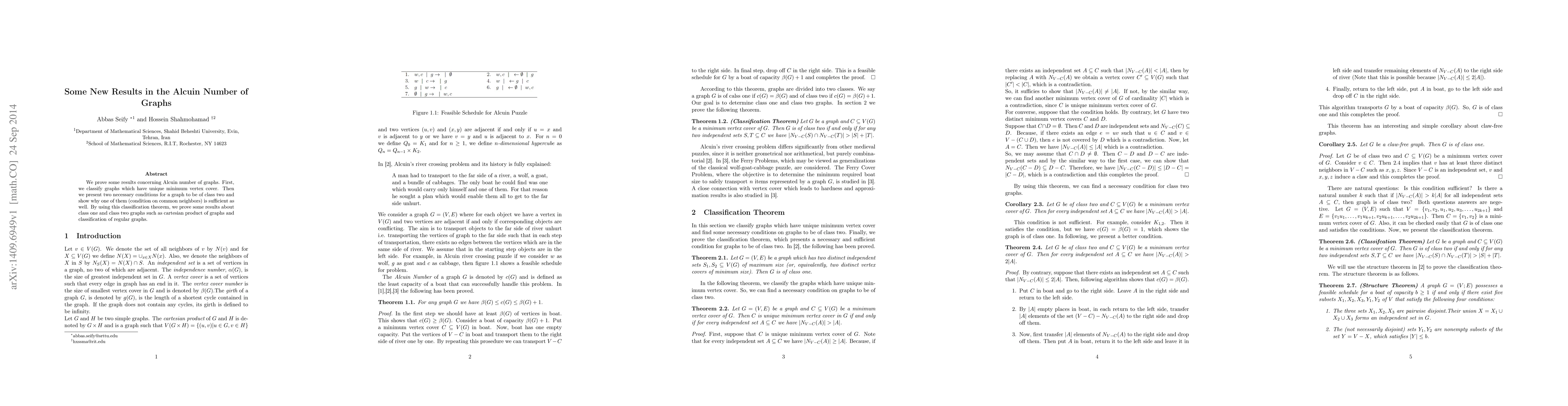 We prove some results concerning Alcuin number of graphs. First, we classify graphs which have unique minimum vertex cover. Then we present two necessary conditions for a graph to be of class two and show why one of them (condition on common neighbors) is sufficient as well. By using this classification theorem, we prove some results about class one and class two graphs such as cartesian product of graphs and classification of regular graphs.
