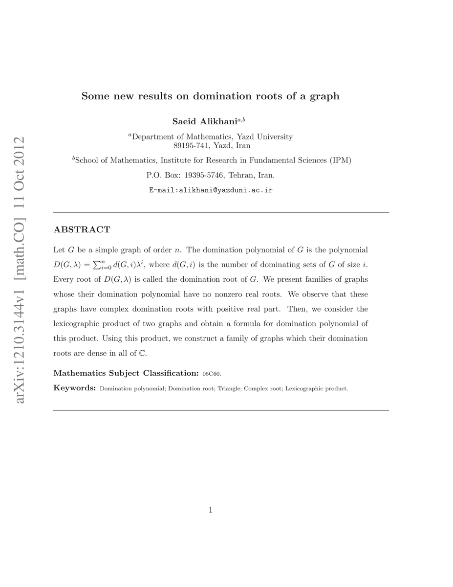 The paper introduces a formula for the domination polynomial of the lexicographic product of graphs and constructs graph families with specific domination root properties.