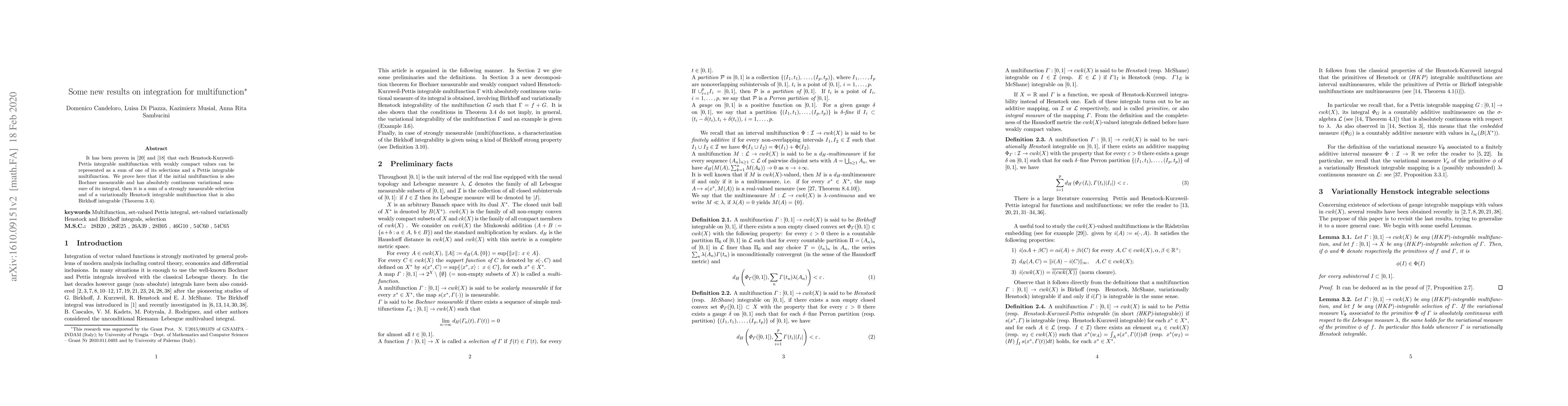 It has been proven in previous papers that each Henstock-Kurzweil-Pettis integrable multifunction with weakly compact values can be represented as a sum of one of its selections and a Pettis integrable multifunction. We prove here that if the initial multifunction is also Bochner measurable and has absolutely continuous variational measure of its integral, then it is a sum of a strongly measurable selection and of a variationally Henstock integrable multifunction that is also Birkhoff integrable.