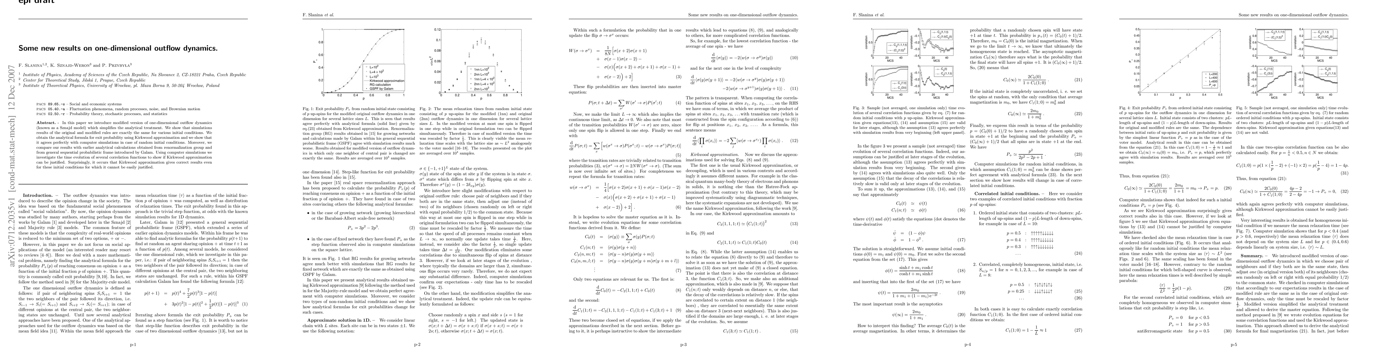 In this paper we introduce modified version of one-dimensional outflow dynamics (known as a Sznajd model) which simplifies the analytical treatment. We show that simulations results of the original and modified rules are exactly the same for various initial conditions. We obtain the analytical formula for exit probability using Kirkwood approximation and we show that it agrees perfectly with computer simulations in case of random initial conditions. Moreover, we compare our results with earlier analytical calculations obtained from renormalization group and from general sequential probabilistic frame introduced by Galam. Using computer simulations we investigate the time evolution of several correlation functions to show if Kirkwood approximation can be justified. Surprisingly, it occurs that Kirkwood approximation gives correct results even for these initial conditions for which it cannot be easily justified.