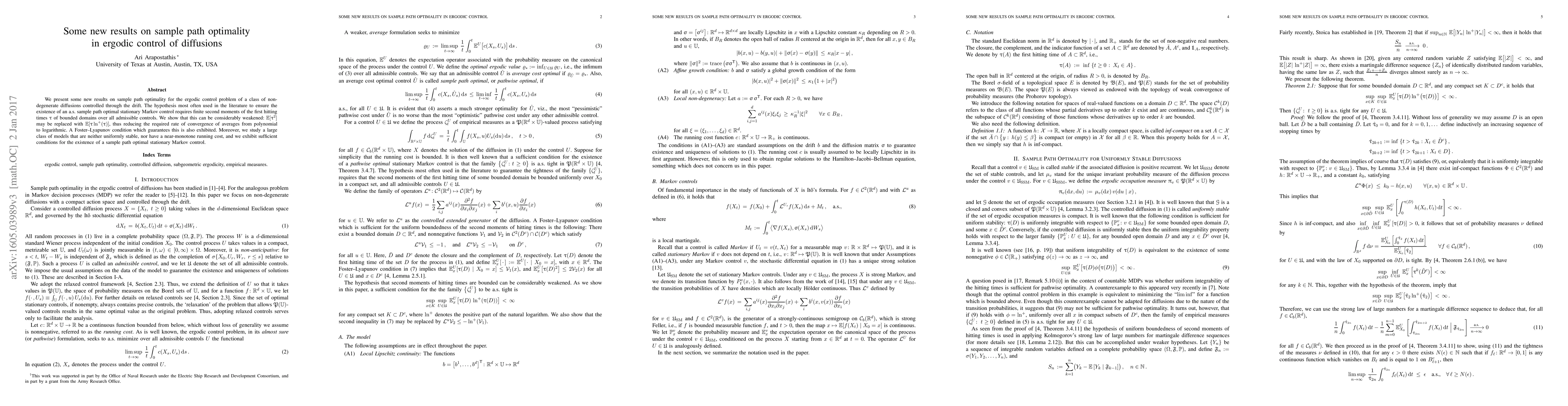 We present some new results on sample path optimality for the ergodic control problem of a class of non-degenerate diffusions controlled through the drift. The hypothesis most often used in the literature to ensure the existence of an a.s. sample path optimal stationary Markov control requires finite second moments of the first hitting times $\tau$ of bounded domains over all admissible controls. We show that this can be considerably weakened: ${\mathrm E}[\tau^2]$ may be replaced with ${\mathrm E}[\tau\ln^+(\tau)]$, thus reducing the required rate of convergence of averages from polynomial to logarithmic. A Foster-Lyapunov condition which guarantees this is also exhibited. Moreover, we study a large class of models that are neither uniformly stable, nor have a near-monotone running cost, and we exhibit sufficient conditions for the existence of a sample path optimal stationary Markov control.