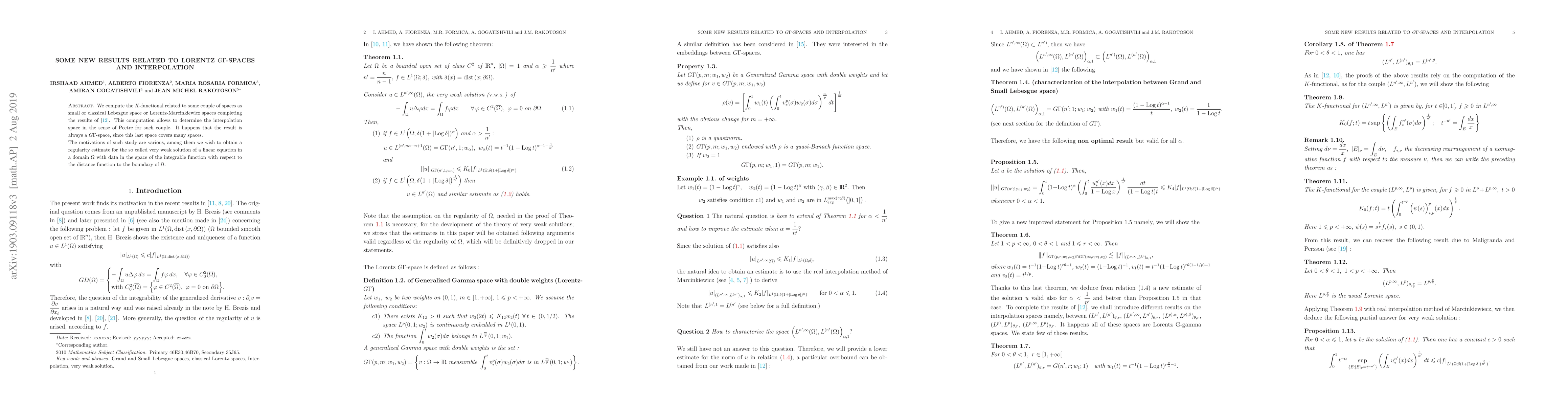 We compute the K-functional related to some couple of spaces as small or classical Lebesgue space or Lorentz-Marcinkiewicz spaces completing the results of the previous works of the authors. This computation allows to determine the interpolation space in the sense of Peetre for such couple. It happens that the result is always a G-gamma space, since this last space covers many spaces. The motivations of such study are various, among them we wish to obtain a regularity estimate for the so called very weak solution of linear equation in a domain Omega with data in the space of the integrable function with respect to the distance function to the boundary of Omega.