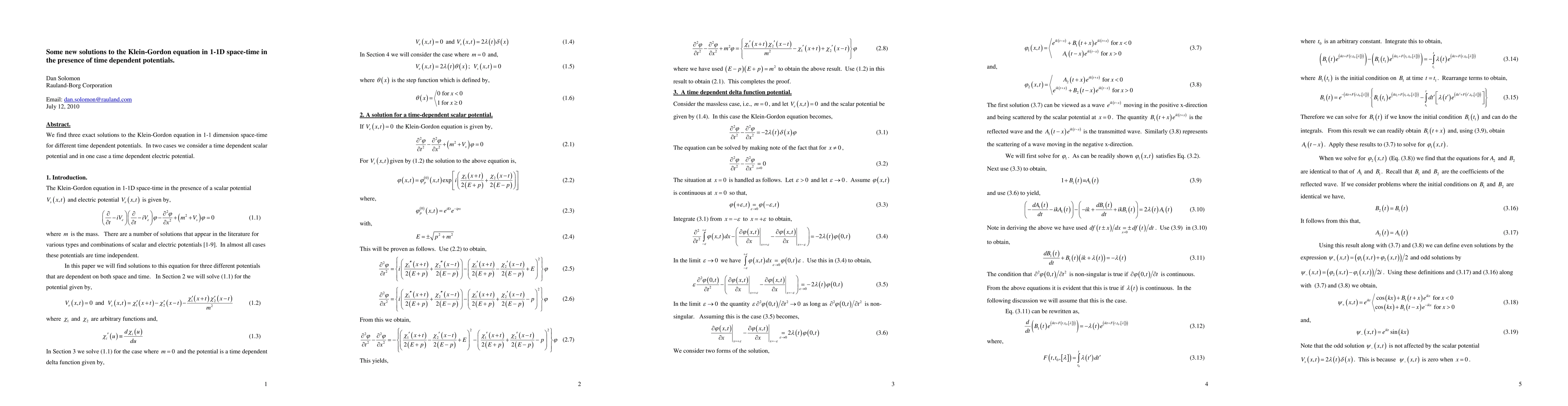 The paper presents three exact solutions to the Klein-Gordon equation in 1-1D space-time under varying time-dependent potentials, including both scalar and electric potentials. These solutions enhance our understanding of relativistic quantum mechanics in reduced dimensions.
