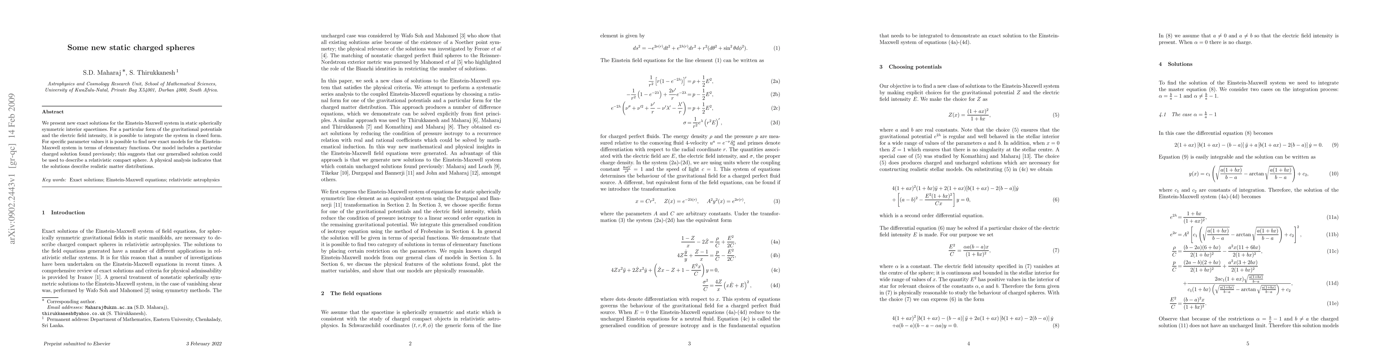 This research introduces new exact solutions for the Einstein-Maxwell system in static, spherically symmetric interior spacetimes, achieved by integrating the system in closed form for specific potential and field intensity forms. These solutions include a previously found charged model, suggesting their applicability for describing relativistic compact spheres, and physical analysis indicates they represent realistic matter distributions.