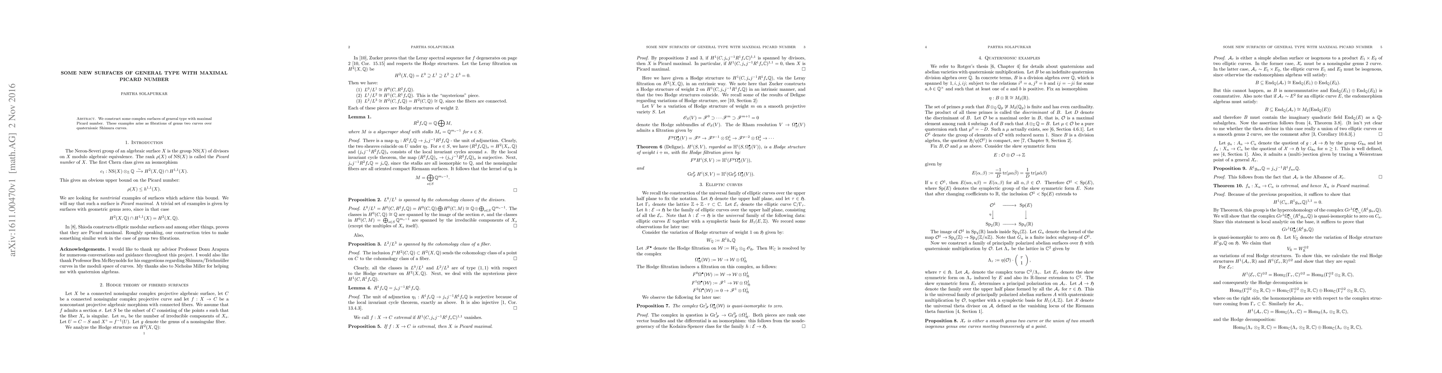 This paper constructs new complex surfaces of general type featuring the maximal Picard number, arising from fibrations of genus two curves over quaternionic Shimura curves, providing novel examples in the study of algebraic surfaces.