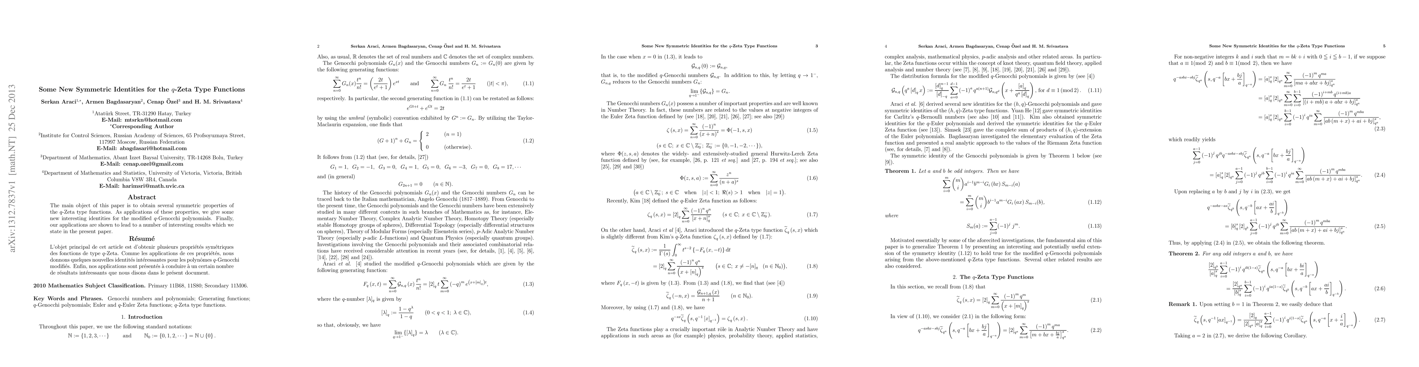 The main object of this paper is to obtain several symmetric properties of the q-Zeta type functions. As applications of these properties, we give some new interesting identities for the modified q-Genocchi polynomials. Finally, our applications are shown to lead to a number of interesting results which we state in the present paper.
