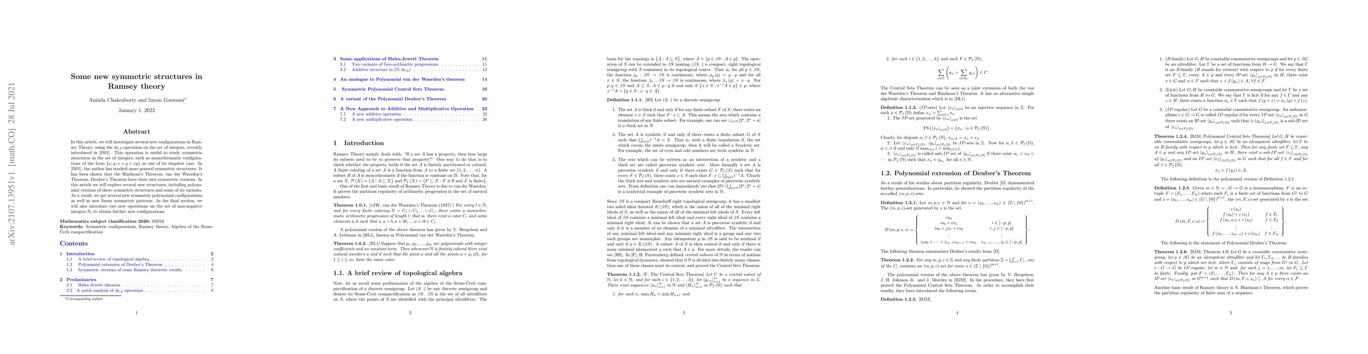 This paper explores new symmetric structures in Ramsey theory using the $\ostar_{l,k}$-operation, introducing polynomial versions and variants of Hindman's, van der Waerden's, and Deuber's theorems. It also presents two new operations on $\mathbb{N}$ to derive additional symmetric configurations.