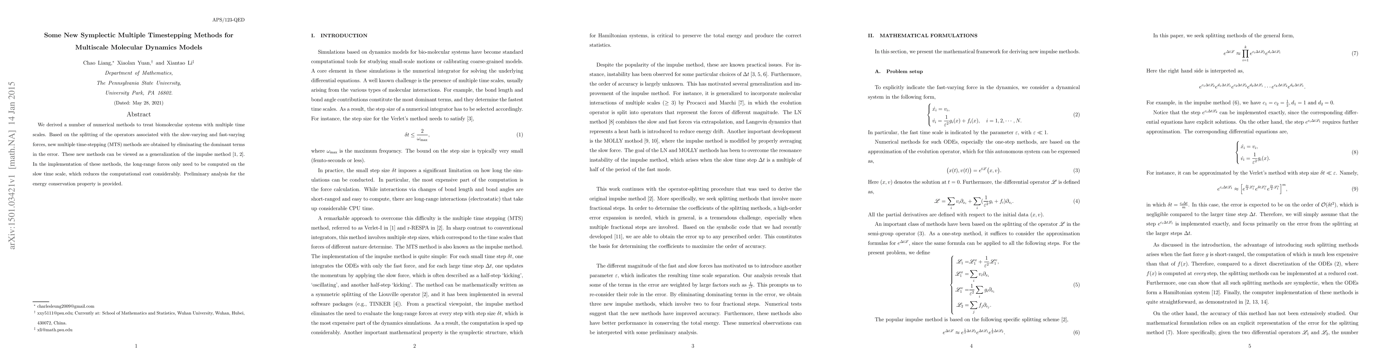We derived a number of numerical methods to treat biomolecular systems with multiple time scales. Based on the splitting of the operators associated with the slow-varying and fast-varying forces, new multiple time-stepping (MTS) methods are obtained by eliminating the dominant terms in the error. These new methods can be viewed as a generalization of the impulse method. In the implementation of these methods, the long-range forces only need to be computed on the slow time scale, which reduces the computational cost considerably. Preliminary analysis for the energy conservation property is provided.