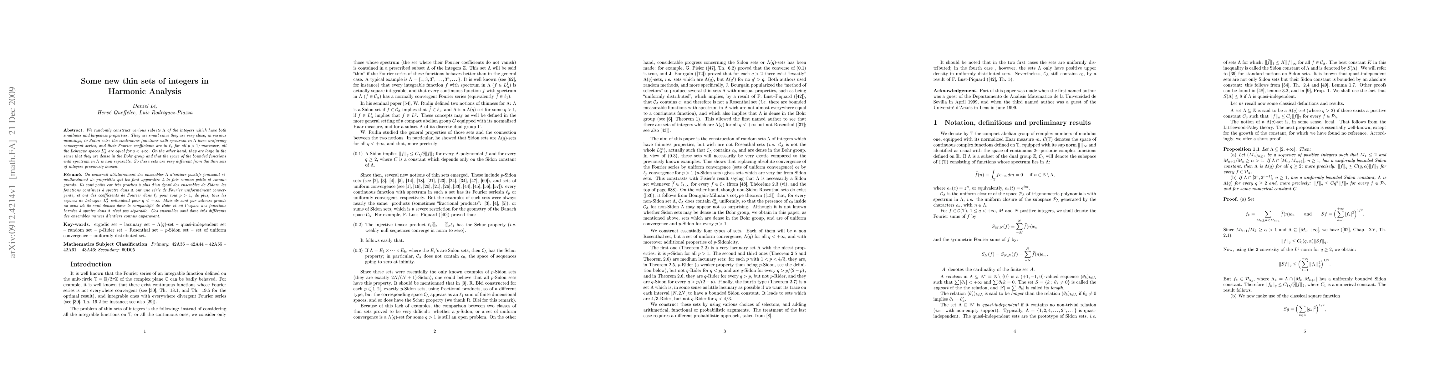 We randomly construct various subsets $\Lambda$ of the integers which have both smallness and largeness properties. They are small since they are very close, in various meanings, to Sidon sets: the continuous functions with spectrum in $\Lambda$ have uniformly convergent series, and their Fourier coefficients are in $\ell_p$ for all $p>1$; moreover, all the Lebesgue spaces $L^q_\Lambda$ are equal for $q<+\infty$. On the other hand, they are large in the sense that they are dense in the Bohr group and that the space of the bounded functions with spectrum in $\Lambda$ is non separable. So these sets are very different from the thin sets of integers previously known.