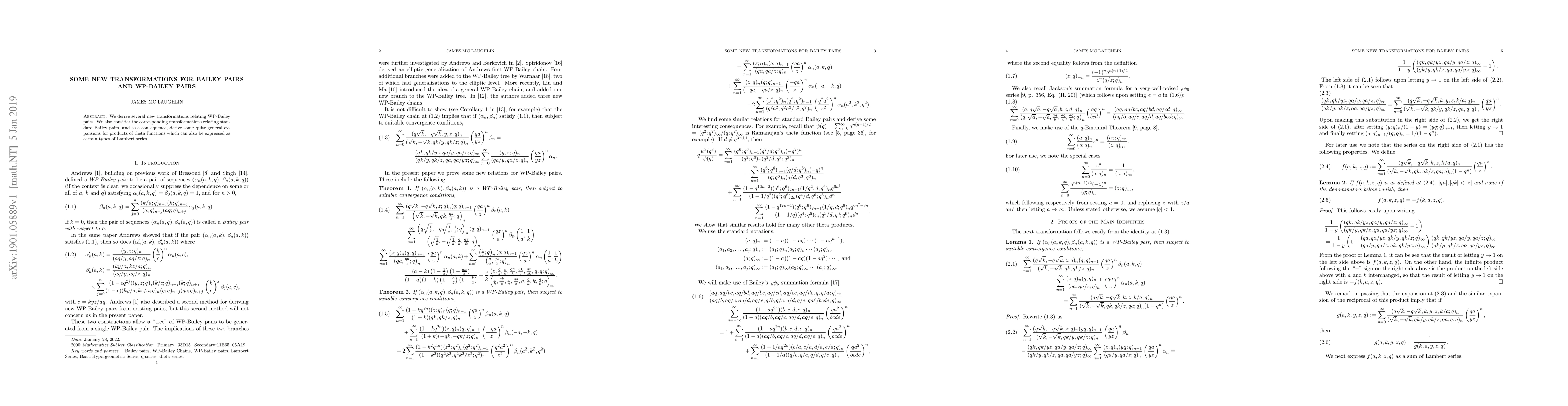 This paper introduces new transformations for WP-Bailey pairs and standard Bailey pairs, leading to general expansions for products of theta functions and Lambert series. The results provide significant insights into the relationships between these mathematical constructs.