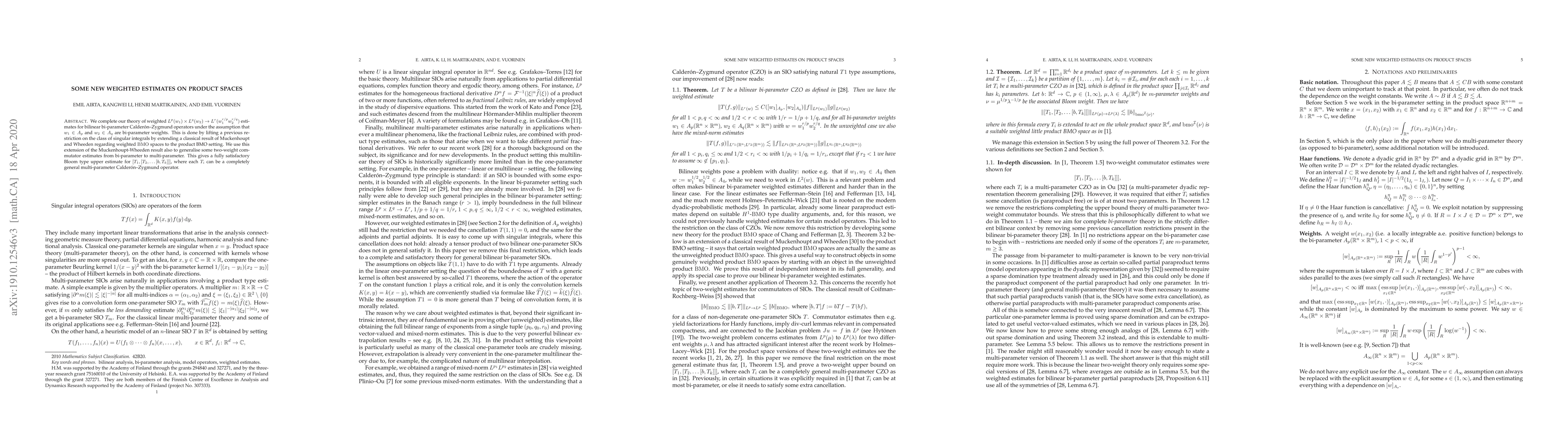We complete our theory of weighted $L^p(w_1) \times L^q(w_2) \to L^r(w_1^{r/p} w_2^{r/q})$ estimates for bilinear bi-parameter Calder\'on--Zygmund operators under the assumption that $w_1 \in A_p$ and $w_2 \in A_q$ are bi-parameter weights. This is done by lifting a previous restriction on the class of singular integrals by extending a classical result of Muckenhoupt and Wheeden regarding weighted BMO spaces to the product BMO setting. We use this extension of the Muckenhoupt-Wheeden result also to generalise some two-weight commutator estimates from bi-parameter to multi-parameter. This gives a fully satisfactory Bloom type upper estimate for $[T_1, [T_2, \ldots [b, T_k]]]$, where each $T_i$ can be a completely general multi-parameter Calder\'on--Zygmund operator.