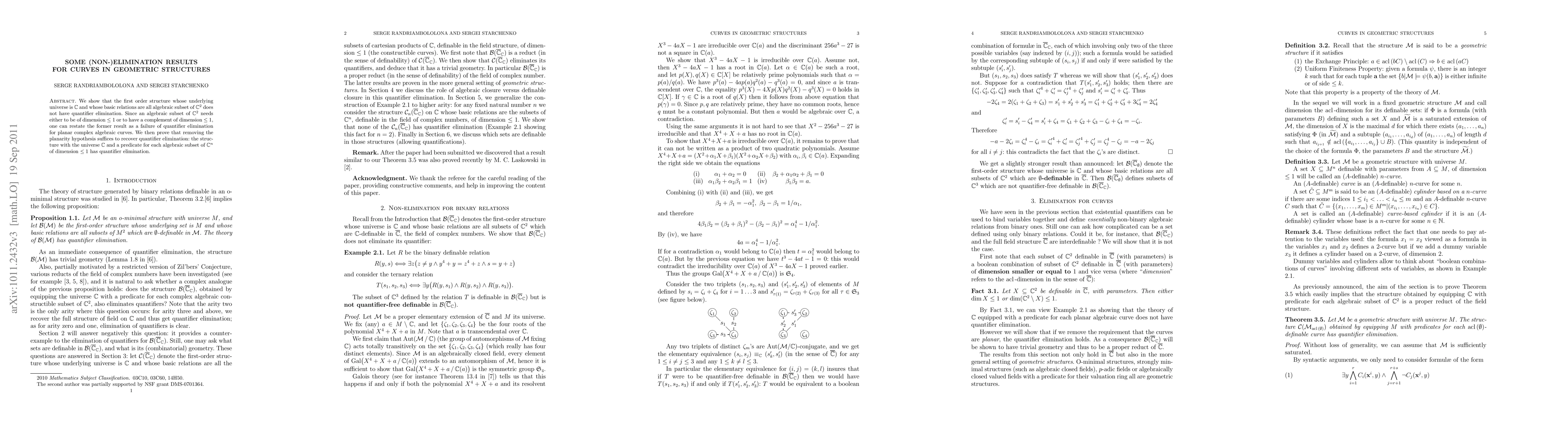We show that the first order structure whose underlying universe is $\mathbb C$ and whose basic relations are all algebraic subset of $\mathbb C^2$ does not have quantifier elimination. Since an algebraic subset of $\mathbb C ^2$ needs either to be of dimension $\leq 1$ or to have a complement of dimension $\leq 1$, one can restate the former result as a failure of quantifier elimination for planar complex algebraic curves. We then prove that removing the planarity hypothesis suffices to recover quantifier elimination: the structure with the universe $\mathbb C$ and a predicate for each algebraic subset of $\mathbb C^n$ of dimension $\leq 1$ has quantifier elimination.