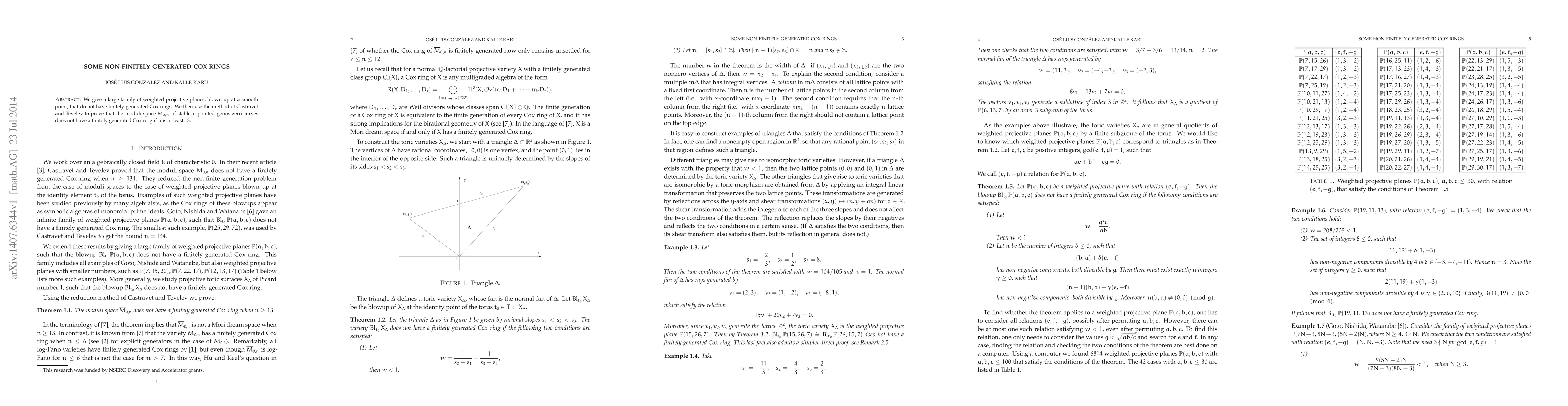 This paper presents a family of weighted projective planes with smooth point blowups that lack finitely generated Cox rings. It also demonstrates, using Castravet and Tevelev's method, that the moduli space of stable genus zero curves with at least 13 points does not have a finitely generated Cox ring.