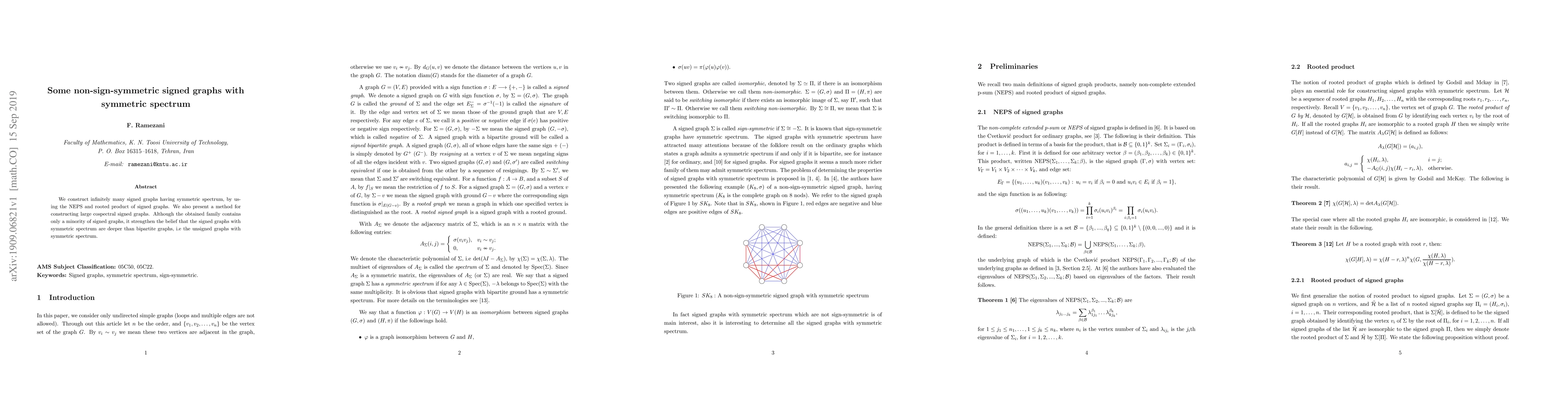 The paper constructs infinitely many signed graphs with symmetric spectrum using NEPS and rooted product of signed graphs, and presents a method for constructing large cospectral signed graphs.