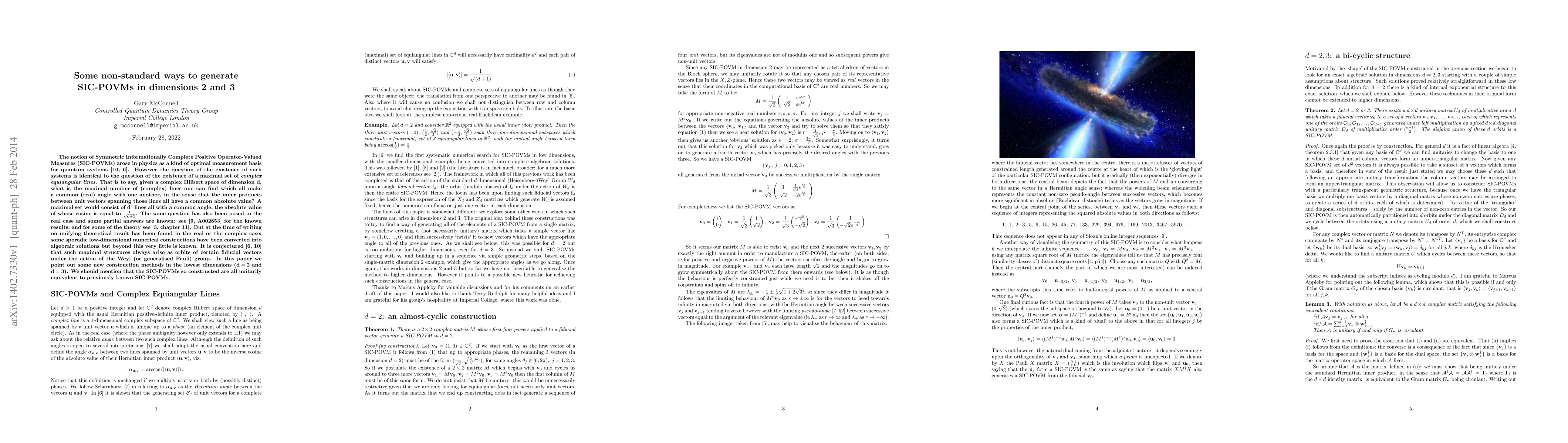 The notion of Symmetric Informationally Complete Positive Operator-Valued Measures (SIC-POVMs) arose in physics as a kind of optimal measurement basis for quantum systems. However the question of their existence is equivalent to that of the existence of a maximal set of \emph{complex equiangular lines}. That is to say, given a complex Hilbert space of dimension $d$, what is the maximal number of (complex) lines one can find which all make a common (real) angle with one another, in the sense that the inner products between unit vectors spanning those lines all have a common absolute value? A maximal set would consist of $d^2$ lines all with a common angle of $\arccos{\frac{1}{\sqrt{d+1}}}$. The same question has been posed in the real case and some partial answers are known. But at the time of writing no unifying theoretical result has been found in the real or the complex case: some sporadic low-dimensional numerical constructions have been converted into algebraic solutions but beyond this very little is known. It is conjectured that such structures always arise as orbits of certain fiducial vectors under the action of the Weyl (or generalised Pauli) group. In this paper we point out some new construction methods in the lowest dimensions ($d=2$ and $d=3$). We should mention that the SIC-POVMs so constructed are all unitarily equivalent to previously known SIC-POVMs.