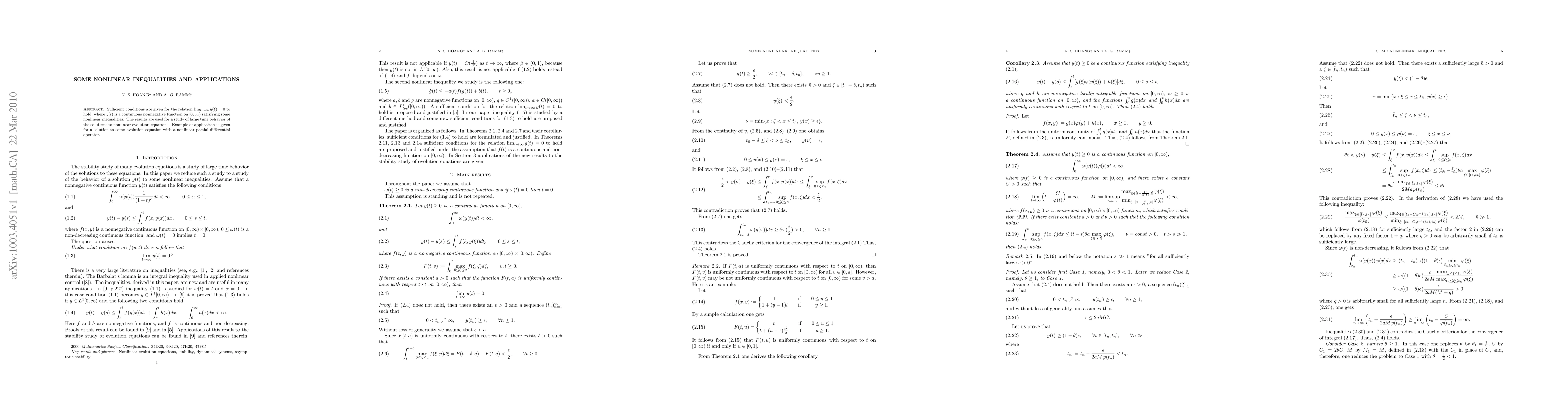 Sufficient conditions are given for the relation $\lim_{t\to\infty}y(t) = 0$ to hold, where $y(t)$ is a continuous nonnegative function on $[0,1)$ satisfying some nonlinear inequalities. The results are used for a study of large time behavior of the solutions to nonlinear evolution equations. Example of application is given for a solution to some evolution equation with a nonlinear partial differential operator.