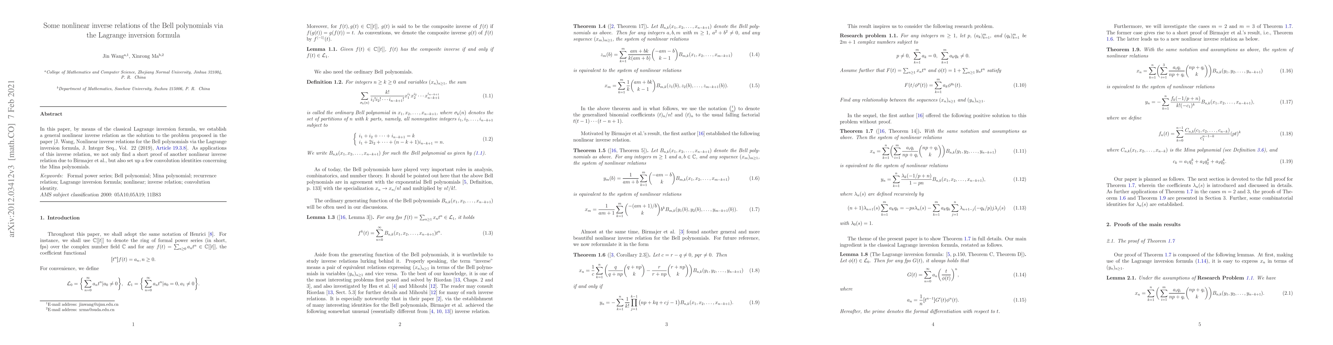 This paper employs the Lagrange inversion formula to derive a general nonlinear inverse relation for Bell polynomials, providing a partial solution to a problem initially posed by Wang. It also offers a concise proof for a previously known inverse relation and establishes new convolution identities for Mina polynomials.