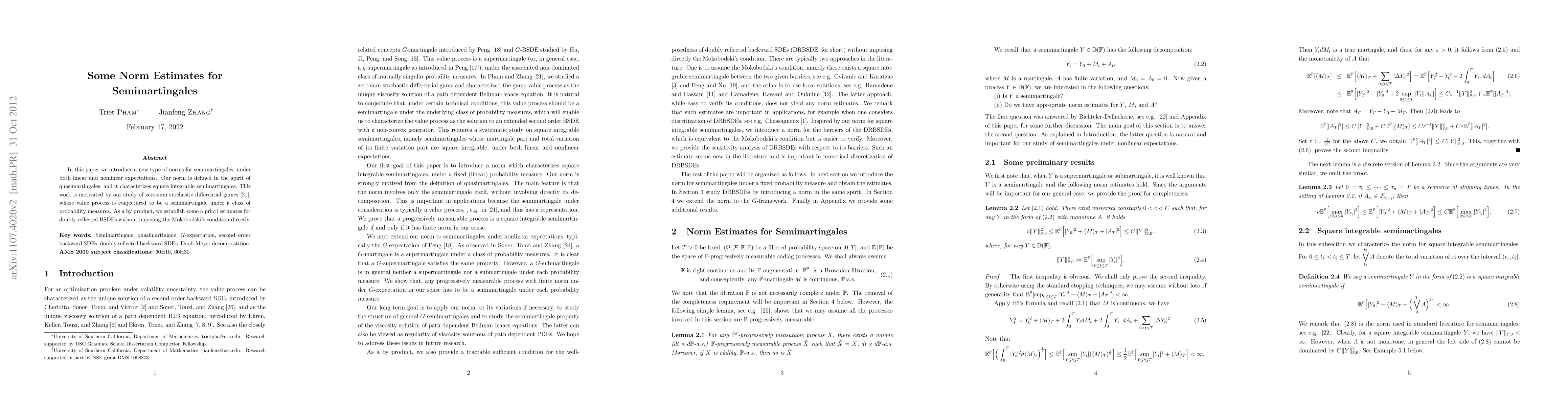 In this paper we introduce a new type of norms for semimartingales, under both linear and nonlinear expectations. Our norm is defined in the spirit of quasimartingales, and it characterizes square integrable semimartingales. This work is motivated by our study of zero-sum stochastic differential games \cite{PZ}, whose value process is conjectured to be a semimartingale under a class of probability measures. As a by product, we establish some a priori estimates for doubly reflected BSDEs without imposing the Mokobodski's condition directly.