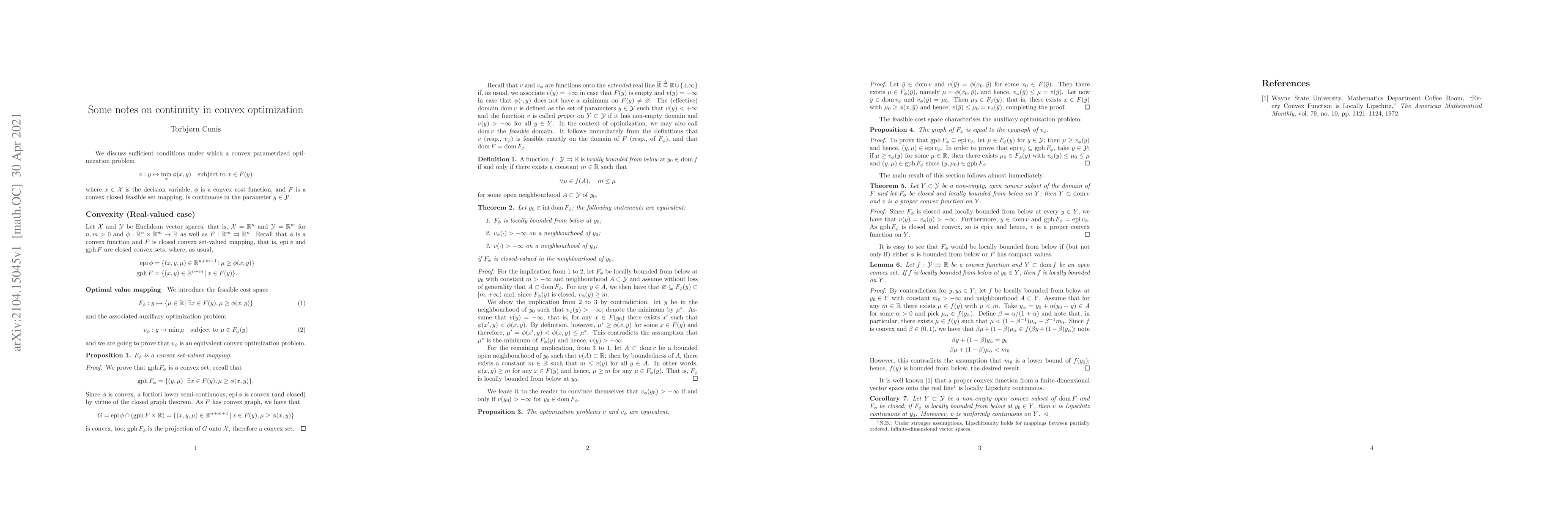 We provide proof that the optimal value function of a convex parametrized optimization problem in Euclidean spaces is itself a convex function onto the extended real line.