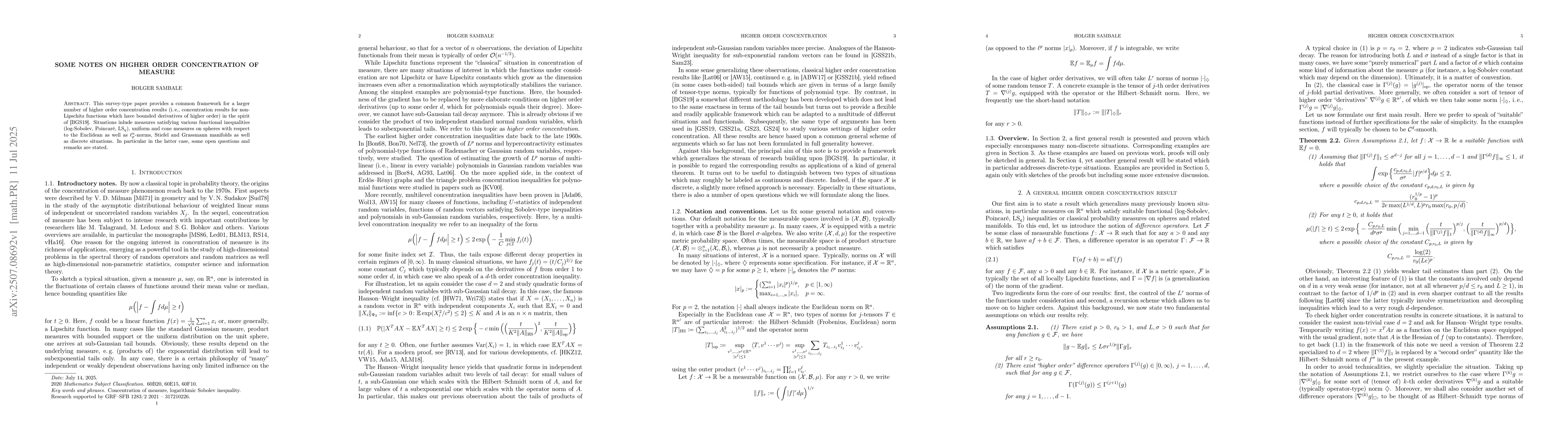 This survey-type paper provides a common framework for a larger number of higher order concentration results (i.\,e., concentration results for non-Lipschitz functions which have bounded derivatives of higher order) in the spirit of Bobkov--G\"otze--Sambale (2019). Situations inlude measures satisfying various functional inequalities (log-Sobolev, Poincar\'{e}, $\mathrm{LS}_q$), uniform and cone measures on spheres with respect to the Euclidean as well as $\ell_p^n$-norms, Stiefel and Grassmann manifolds as well as discrete situations. In particular in the latter case, some open questions and remarks are stated.