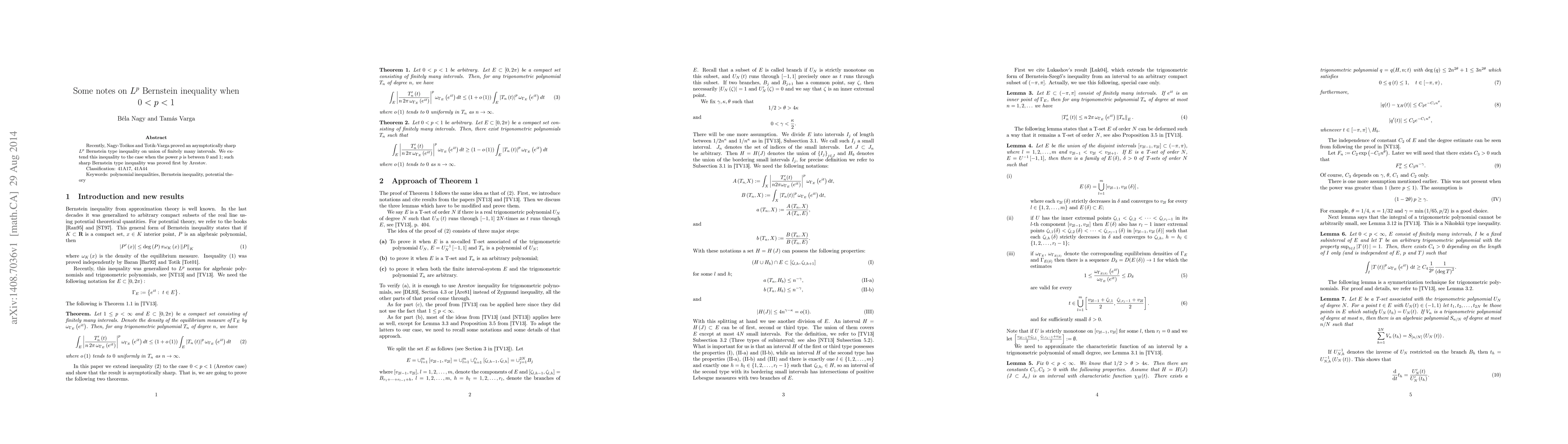 This research extends the $L^p$ Bernstein inequality for union of finitely many intervals, previously proven asymptotically sharp by Nagy-To'okos and Totik-Varga for $0 < p < 1$. It builds on Arestov's initial proof of a sharp Bernstein-type inequality for such $p$ values.