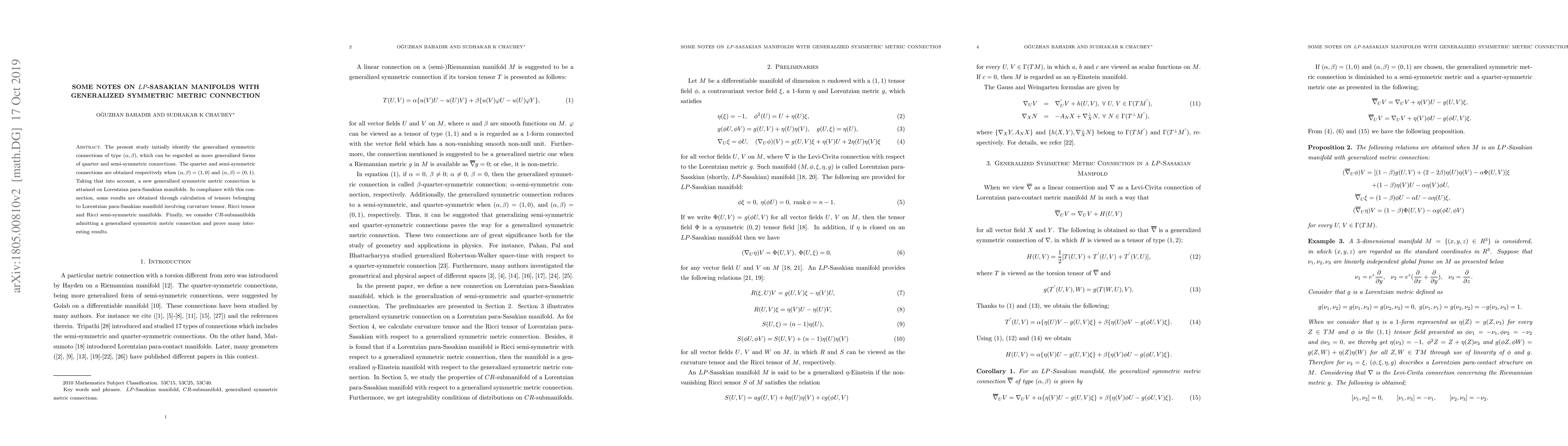 The present study initially identify the generalized symmetric connections of type $(\alpha,\beta)$, which can be regarded as more generalized forms of quarter and semi-symmetric connections. The quarter and semi-symmetric connections are obtained respectively when $(\alpha,\beta)=(1,0)$ and $(\alpha,\beta)=(0,1)$. Taking that into account, a new generalized symmetric metric connection is attained on Lorentzian para-Sasakian manifolds. In compliance with this connection, some results are obtained through calculation of tensors belonging to Lorentzian para-Sasakian manifold involving curvature tensor, Ricci tensor and Ricci semi-symmetric manifolds. Finally, we consider $CR$-submanifolds admitting a generalized symmetric metric connection and prove many interesting results.