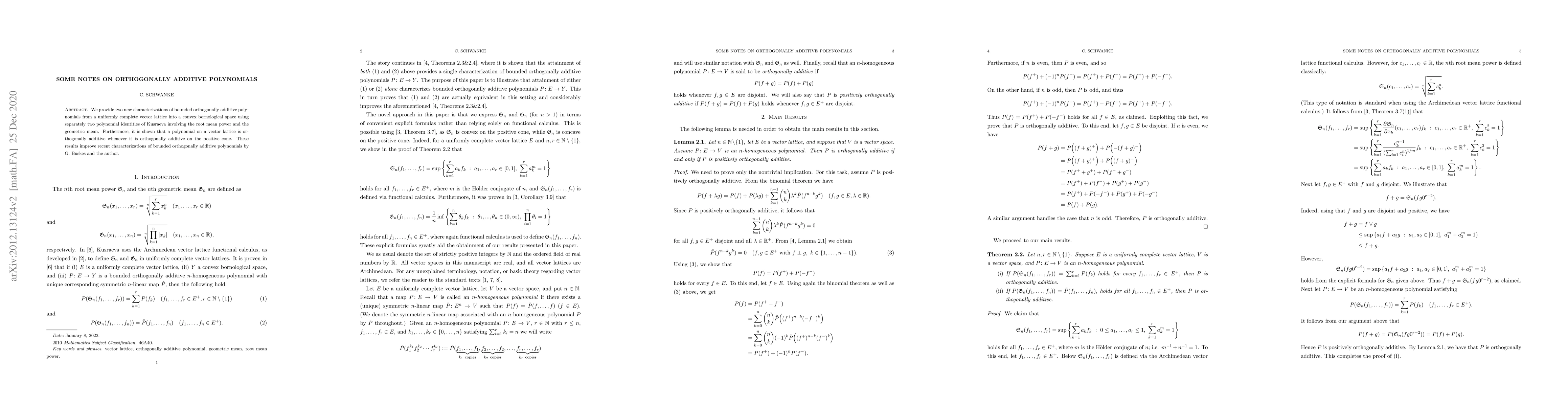 This paper introduces two new characterizations of bounded orthogonally additive polynomials via Kusraeva's polynomial identities. It also establishes that orthogonal additivity on a vector lattice is guaranteed if it holds on the positive cone, enhancing previous work by G. Buskes and the author.