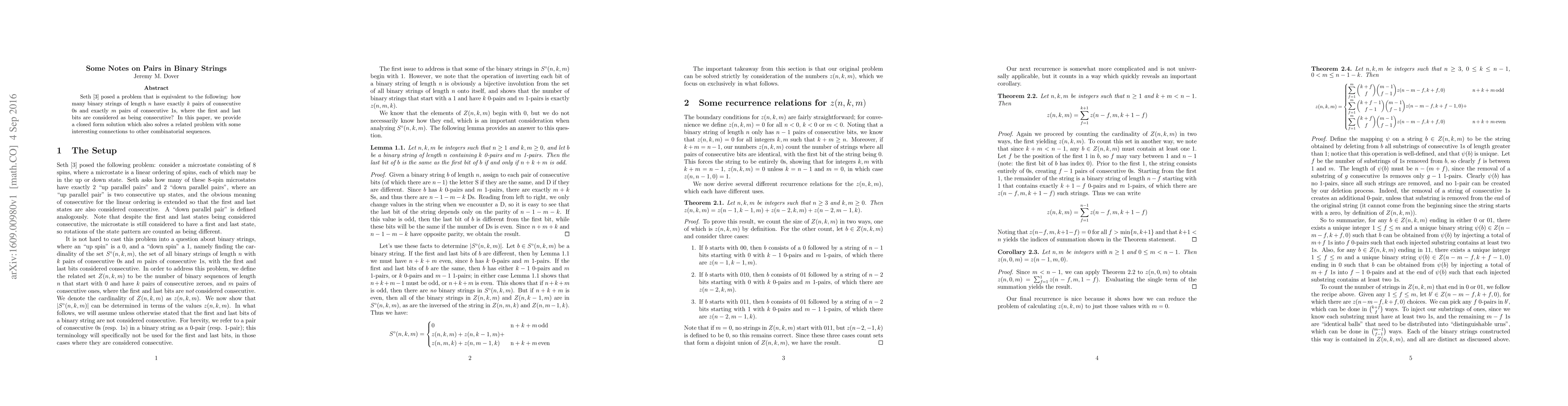 Seth (Mathematics Stack Exchange, http://math.stackexchange.com/q/1812699) posed a problem that is equivalent to the following: how many binary strings of length n have exactly k pairs of consecutive 0s and exactly m pairs of consecutive 1s, where the first and last bits are considered as being consecutive? In this paper, we provide a closed form solution which also solves a related problem with some interesting connections to other combinatorial sequences.