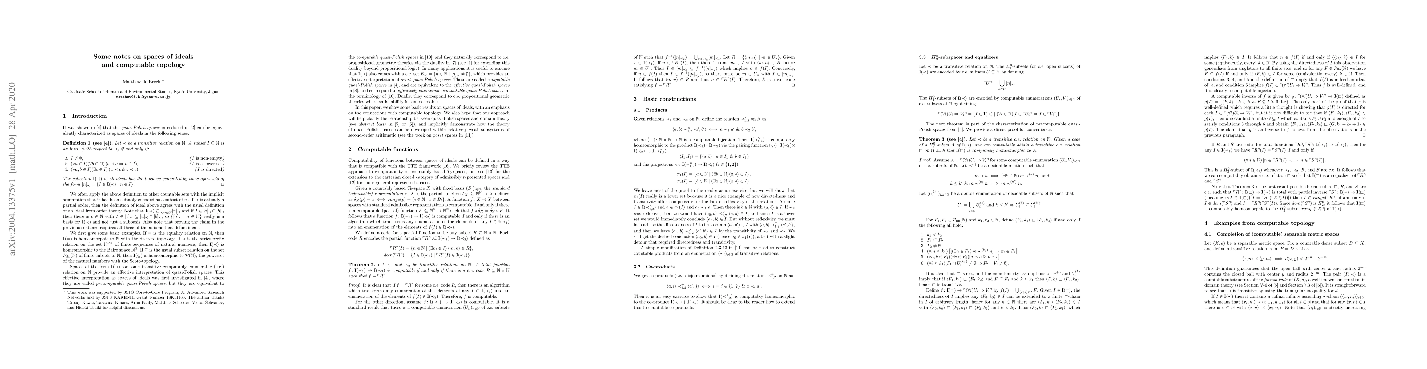 The paper introduces a method for constructing transitive c.e. relations from codes of Π₀₂ subsets of spaces of ideals, establishing a direct link between computable topology and quasi-Polish spaces.
