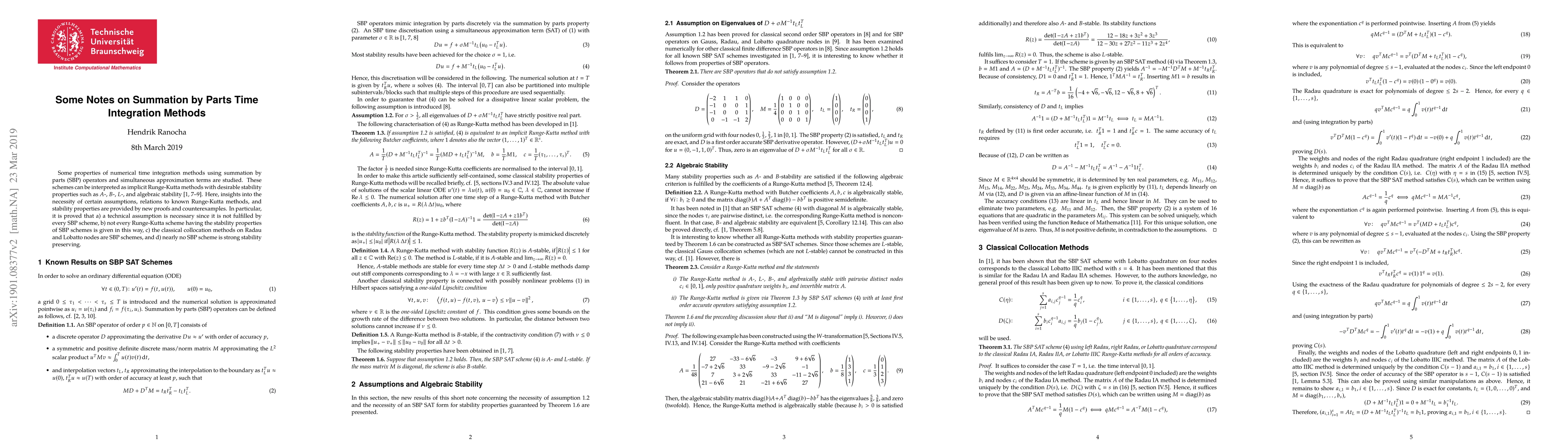 This paper investigates summation by parts (SBP) time integration methods, revealing their stability properties and connections to Runge-Kutta methods. It proves the necessity of specific technical assumptions for SBP schemes and demonstrates that not all stable Runge-Kutta methods are SBP schemes, while classical collocation methods on Radau and Lobatto nodes are indeed SBP schemes.