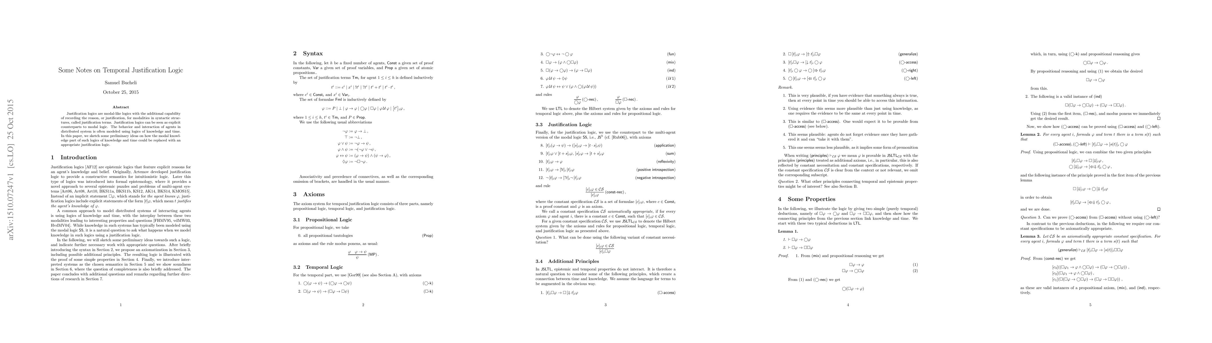 Justification logics are modal-like logics with the additional capability of recording the reason, or justification, for modalities in syntactic structures, called justification terms. Justification logics can be seen as explicit counterparts to modal logic. The behavior and interaction of agents in distributed system is often modeled using logics of knowledge and time. In this paper, we sketch some preliminary ideas on how the modal knowledge part of such logics of knowledge and time could be replaced with an appropriate justification logic.